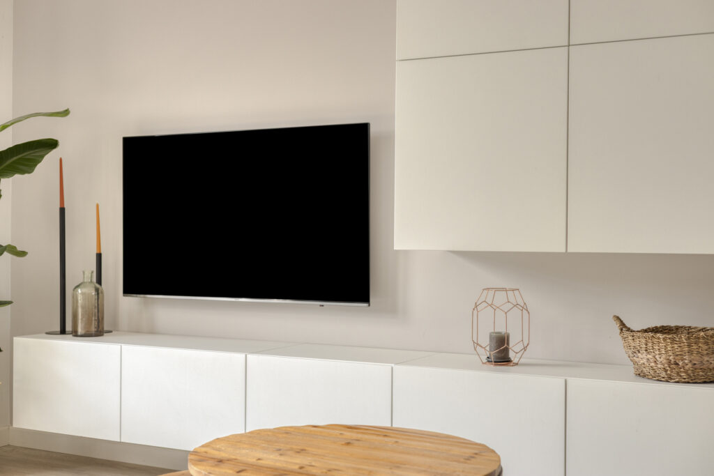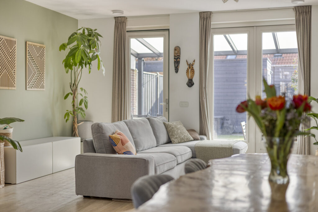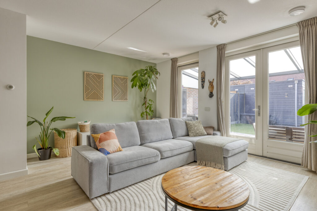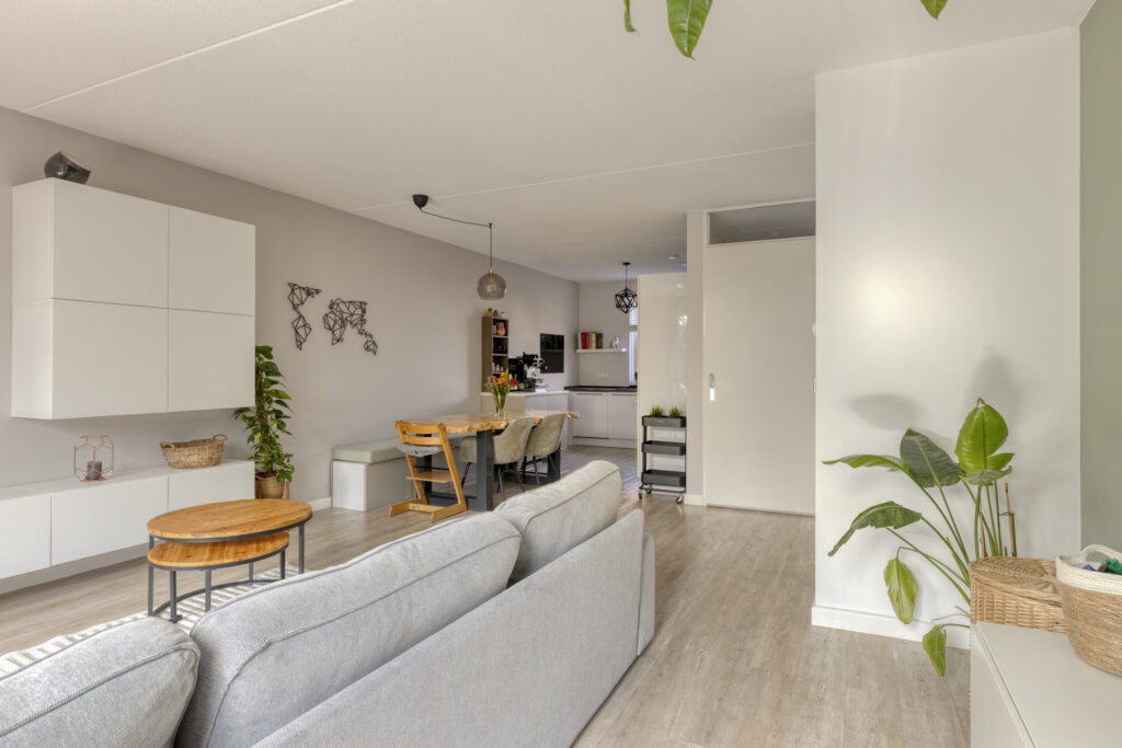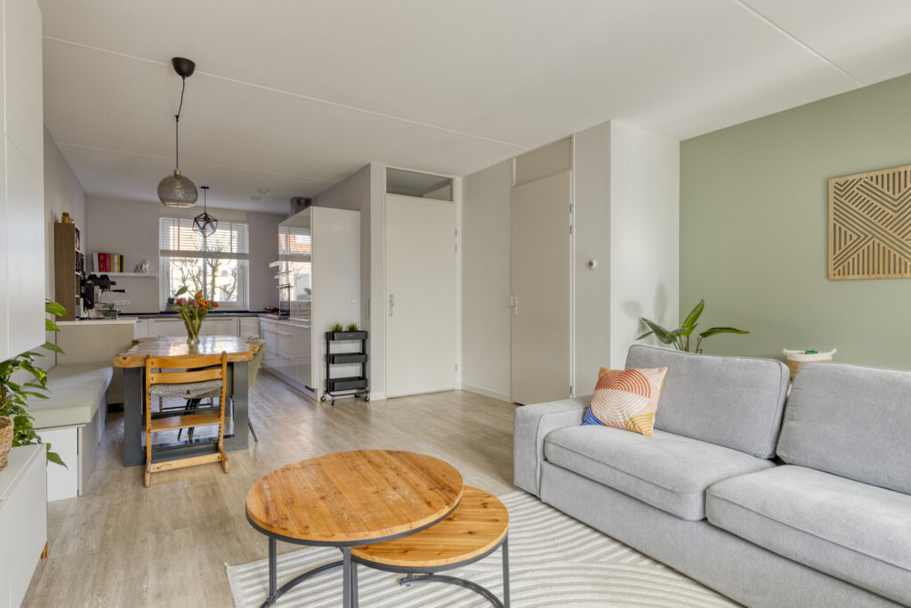 De ruime woonkamer is eveneens voorzien van een pvc-vloer met vloerverwarming en strak afgewerkte wanden. Dankzij de openslaande tuindeuren en de ligging op het zuiden geniet de woonkamer van een prettige lichtinval. Daarnaast beschikt de woonkamer over een praktische trapkast voor extra bergruimte.