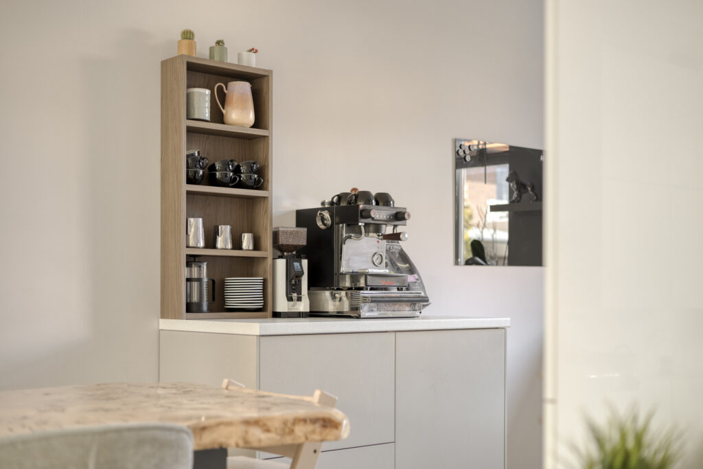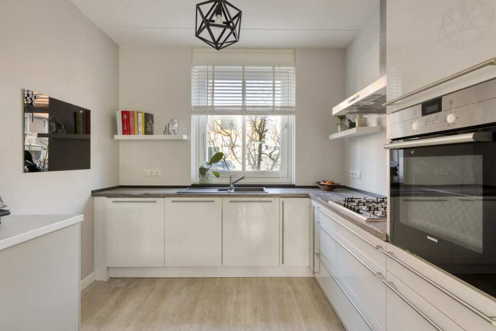 De open keuken bevindt zich aan de voorzijde van de woning en is uitgevoerd in een praktische hoekopstelling met veel werk- en bergruimte. De keuken is voorzien van diverse inbouwapparatuur (Siemens en Neff), waaronder een 5-pits gaskookplaat, afzuigkap, koelkast, vrieskast, oven en een geïntegreerde vaatwasser.