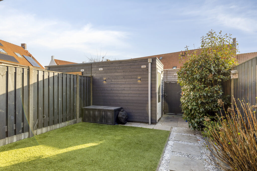 Achter in de tuin bevindt zich een houten berging met elektra en verlichting. Tevens is er een achterom aanwezig via het gemeenschappelijke achterpad.