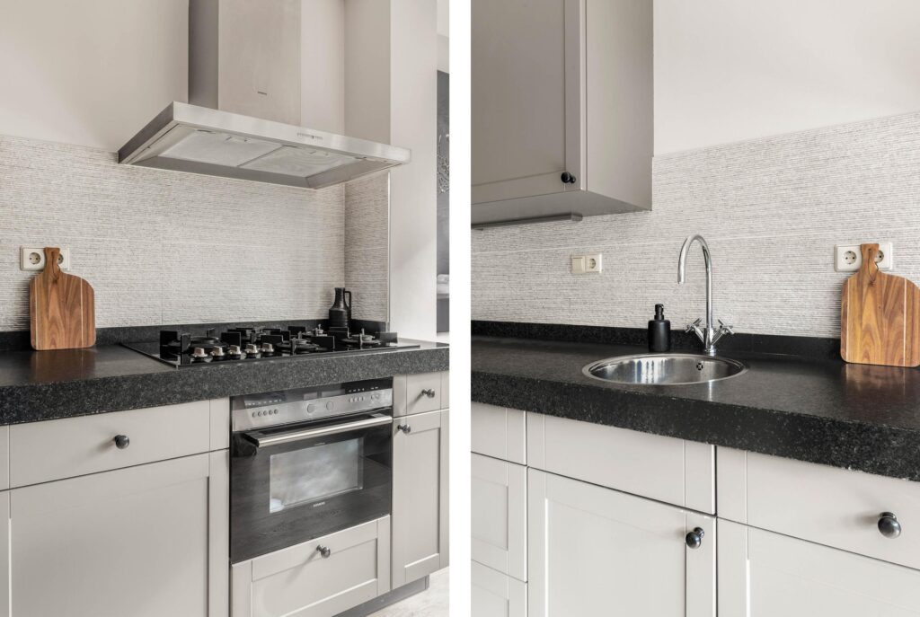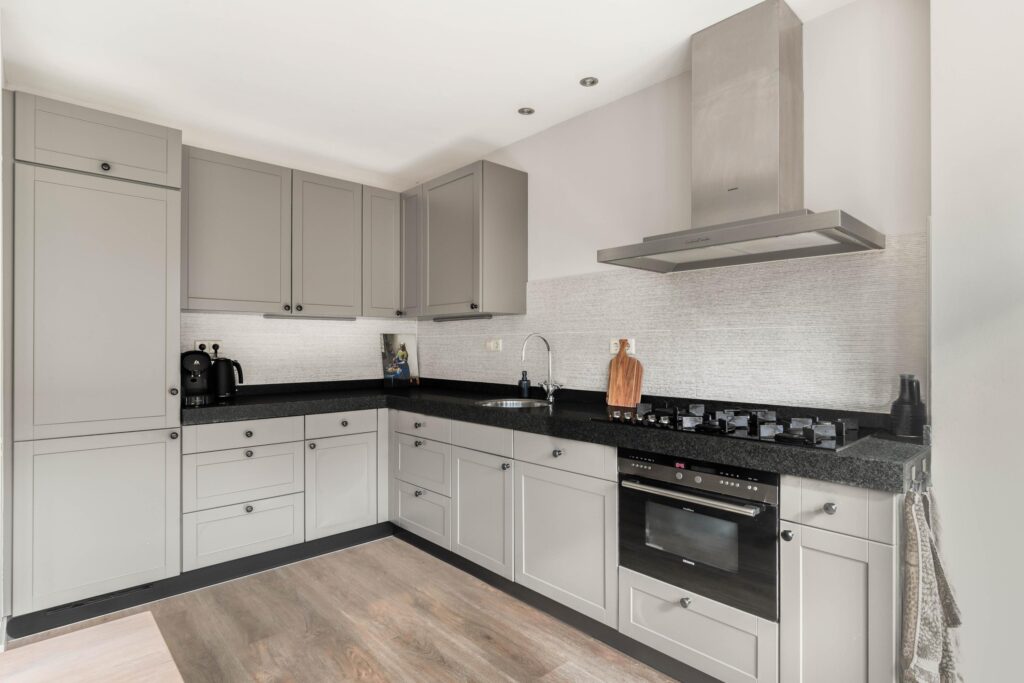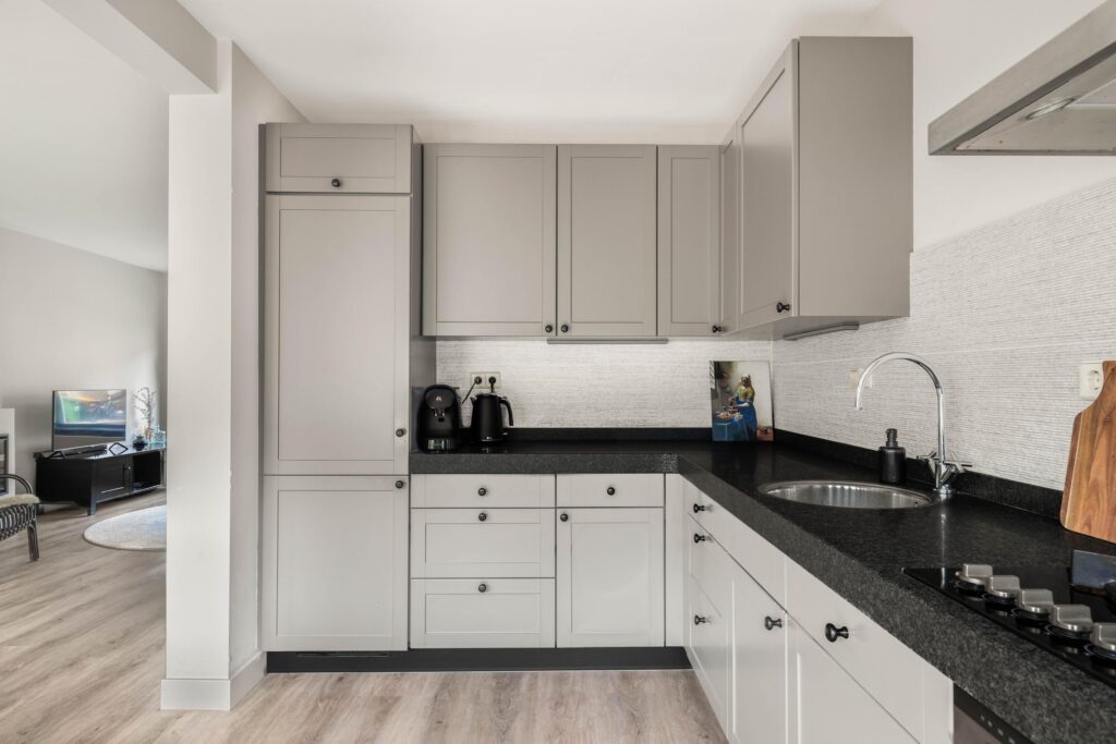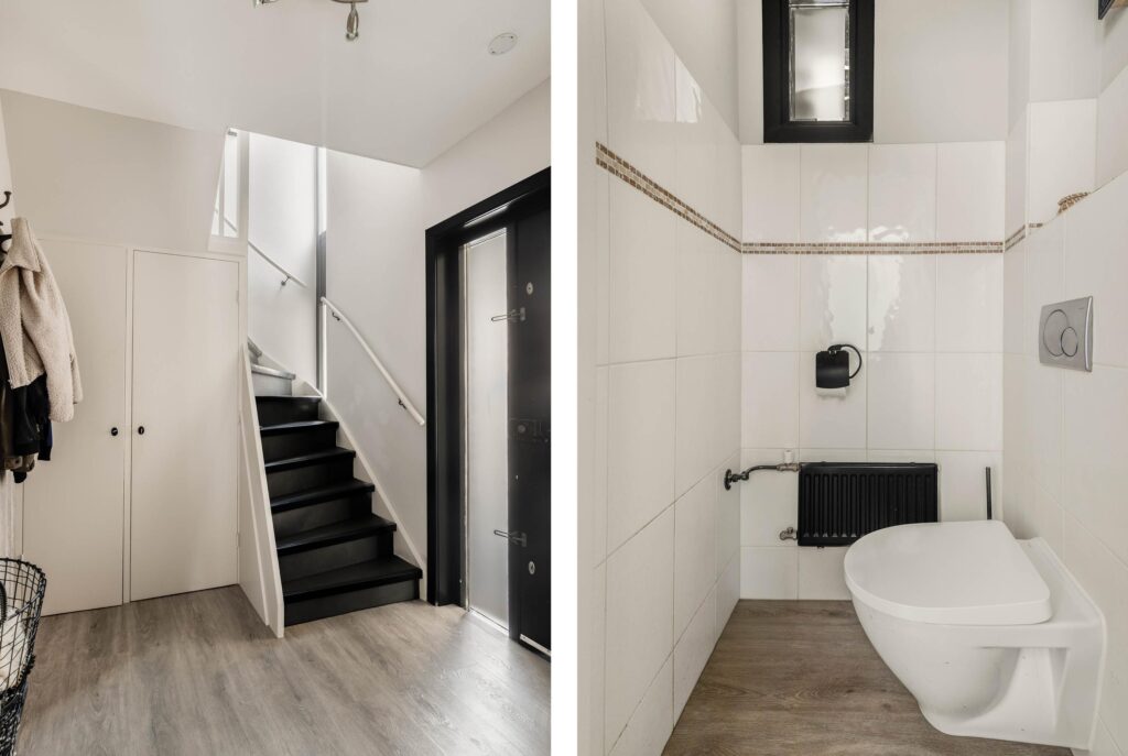 De entree bevindt zich aan de zijkant van de woning en leidt naar een ruime hal met garderobe, toilet, trapopgang en toegang tot de lichte woonkamer met open keuken. Dankzij de grote raampartijen aan zowel de voor- als achterzijde baadt de woning in het daglicht. De woonkamer is sfeervol ingedeeld met een zitgedeelte aan de voorzijde en een eetgedeelte met open keuken aan de achterzijde. De keuken, opgesteld in een praktische hoekopstelling, is voorzien van diverse inbouwapparatuur en biedt via openslaande deuren en grote ramen een prachtige verbinding met de zonnige achtertuin.