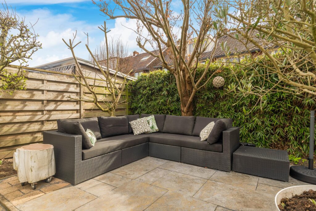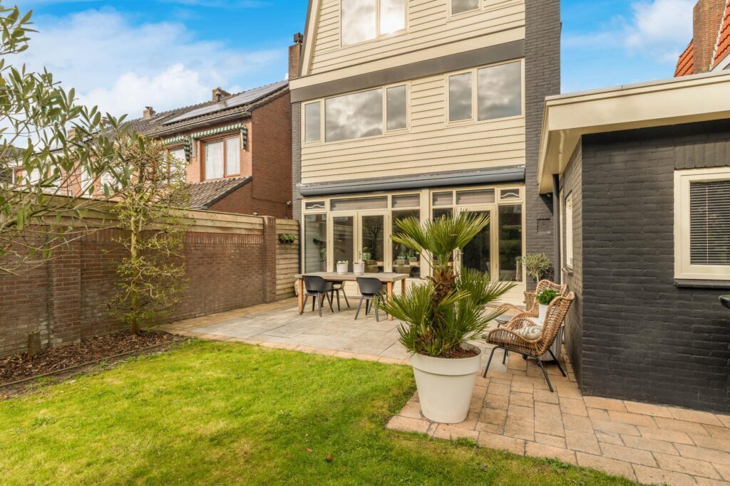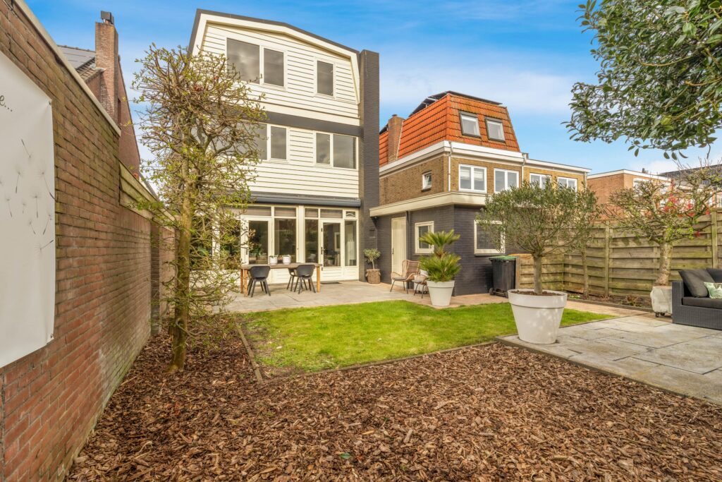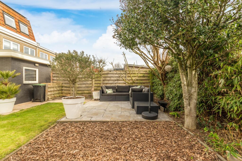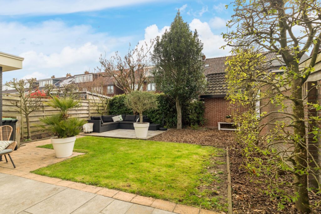 De achtertuin is fraai aangelegd met twee terrassen – één direct aan de woning en één achterin de tuin – omringd door groen en een verzorgd gazon. Dankzij de gunstige ligging op het zuidoosten kunt u hier de hele dag door genieten van de zon.