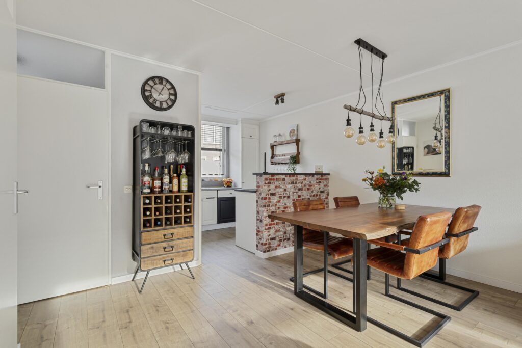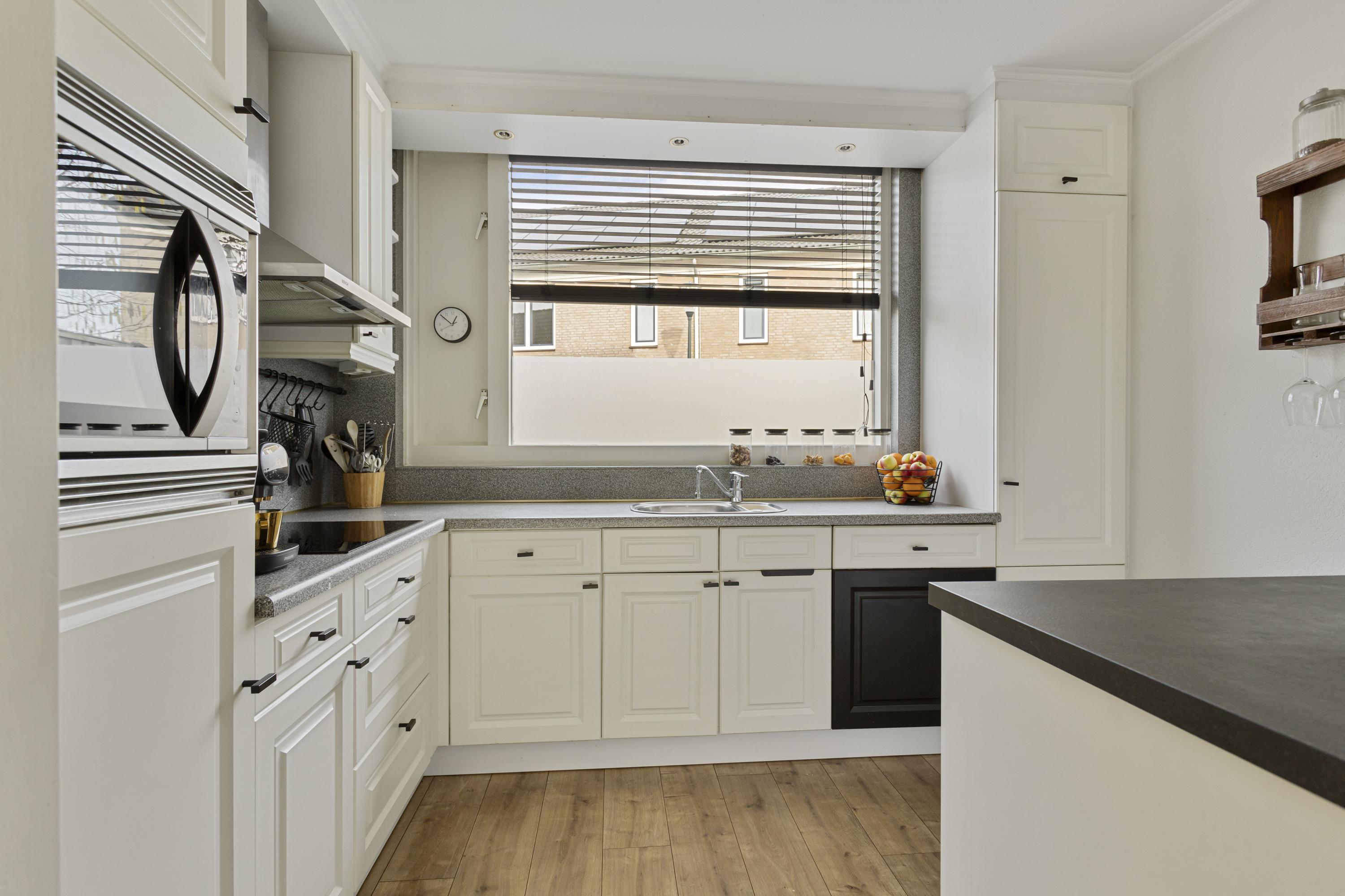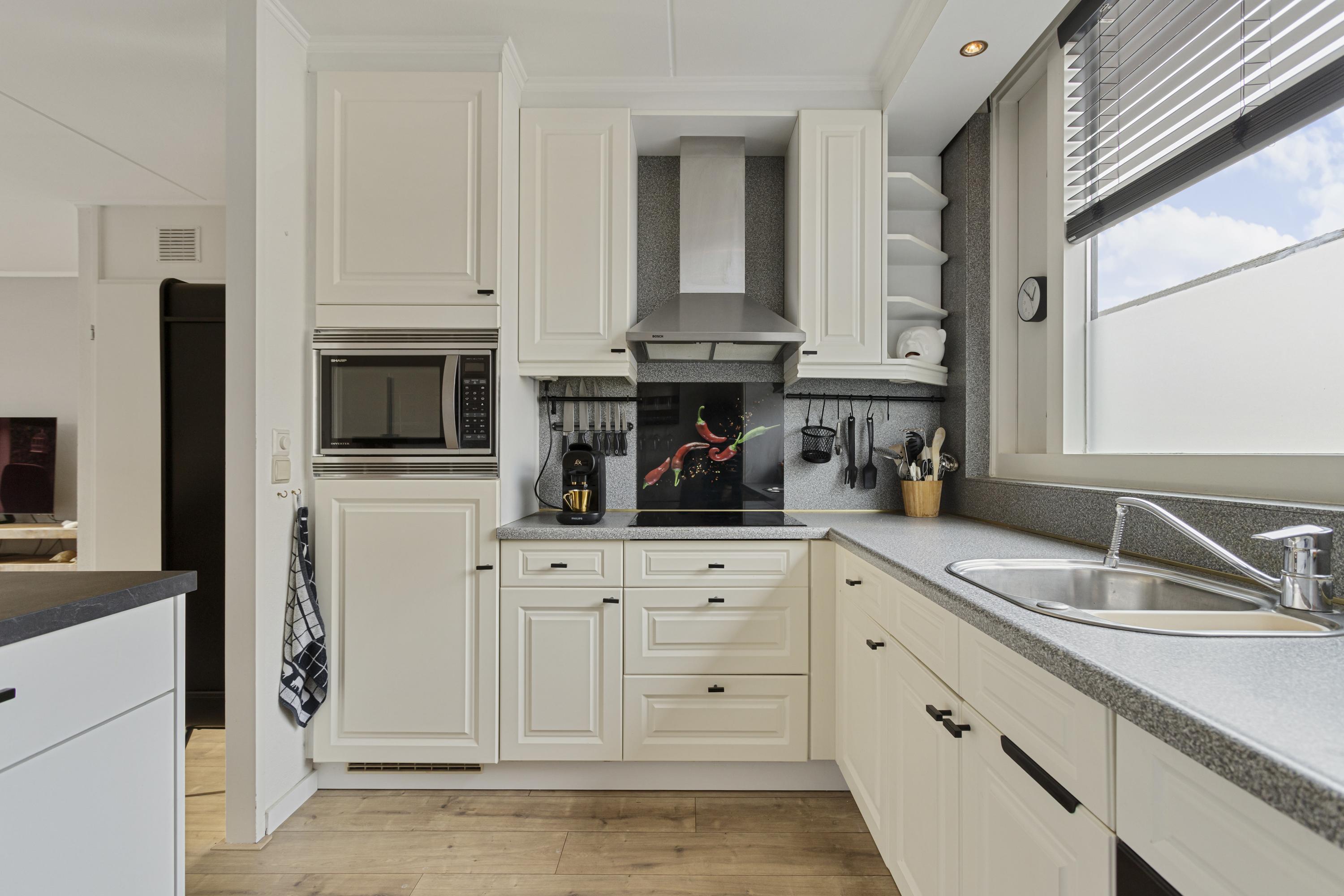Complete keuken in hoekopstelling en handige kastenwand gelegen aan de voorzijde van de woning. De keuken is uitgerust met o.a. een koelkast, 4 pits inductiekookplaat (2023), rvs-afzuigkap, vaatwasser, spoelbak, magnetron en diverse onder- en bovenkasten.