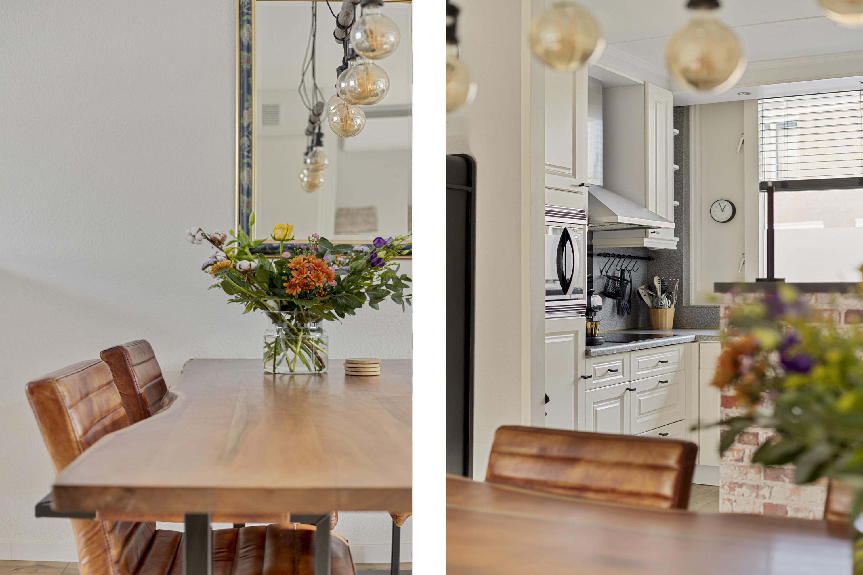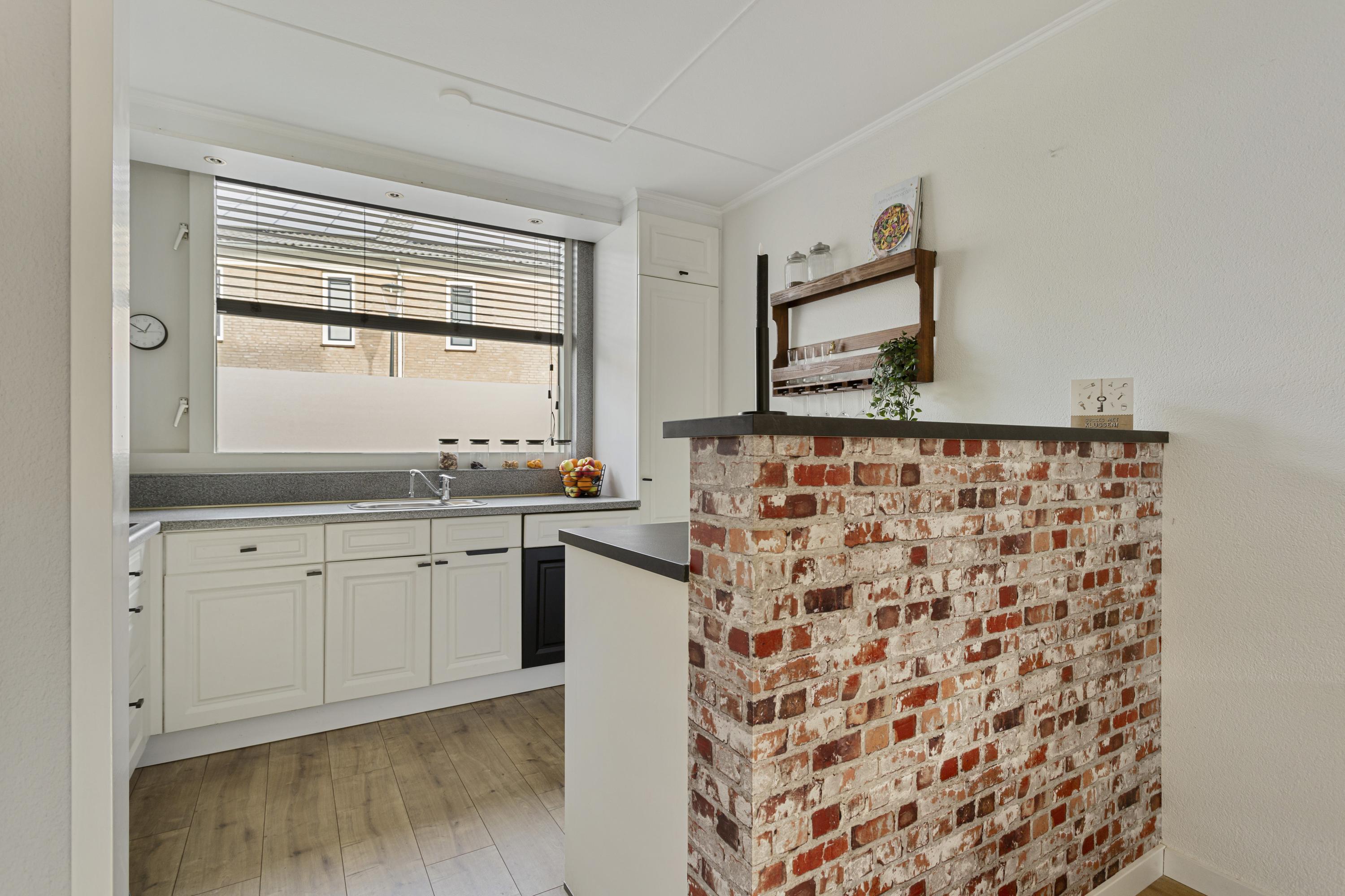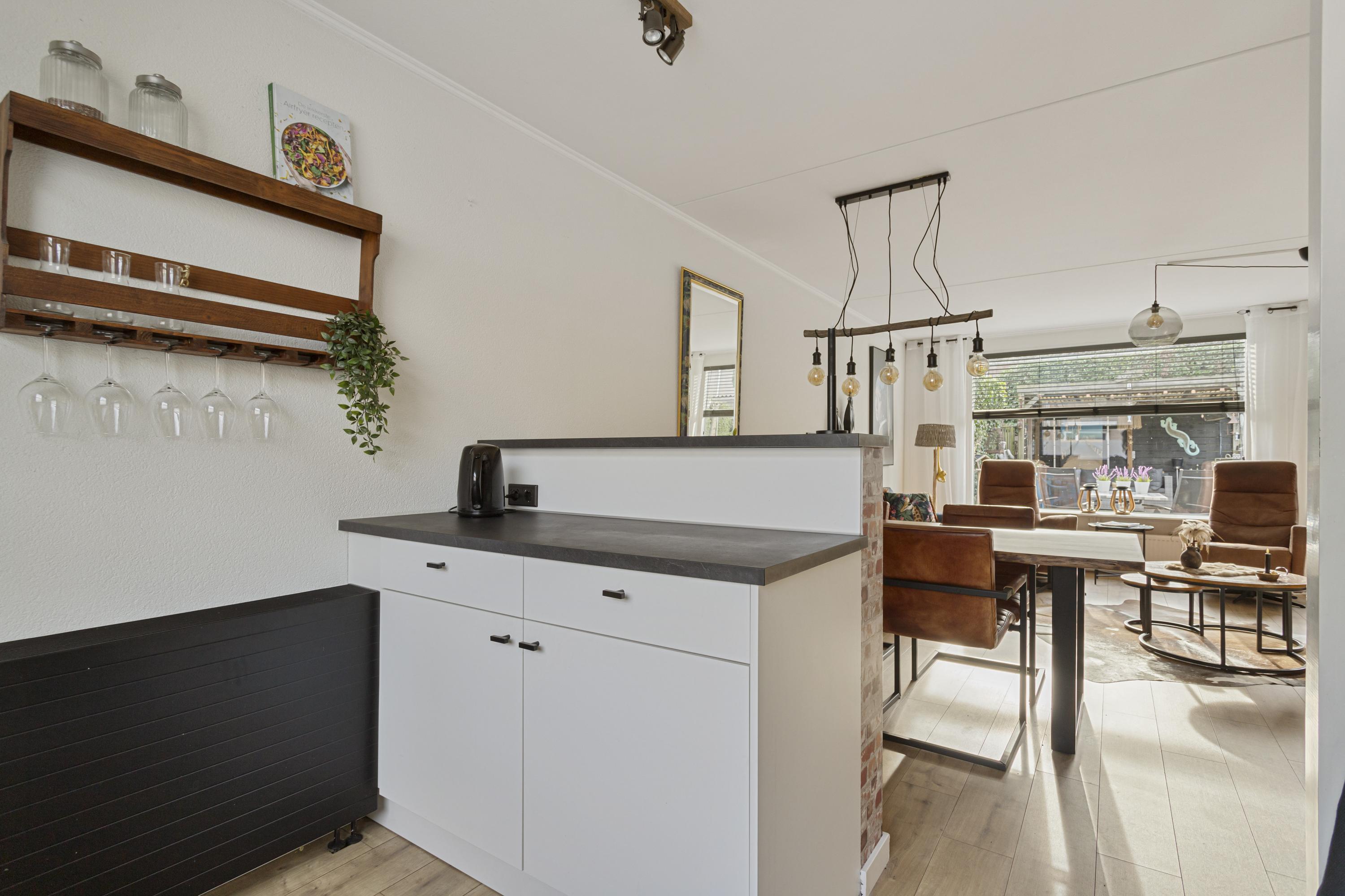 Complete keuken in hoekopstelling en handige kastenwand gelegen aan de voorzijde van de woning. De keuken is uitgerust met o.a. een koelkast, 4 pits inductiekookplaat (2023), rvs-afzuigkap, vaatwasser, spoelbak, magnetron en diverse onder- en bovenkasten.