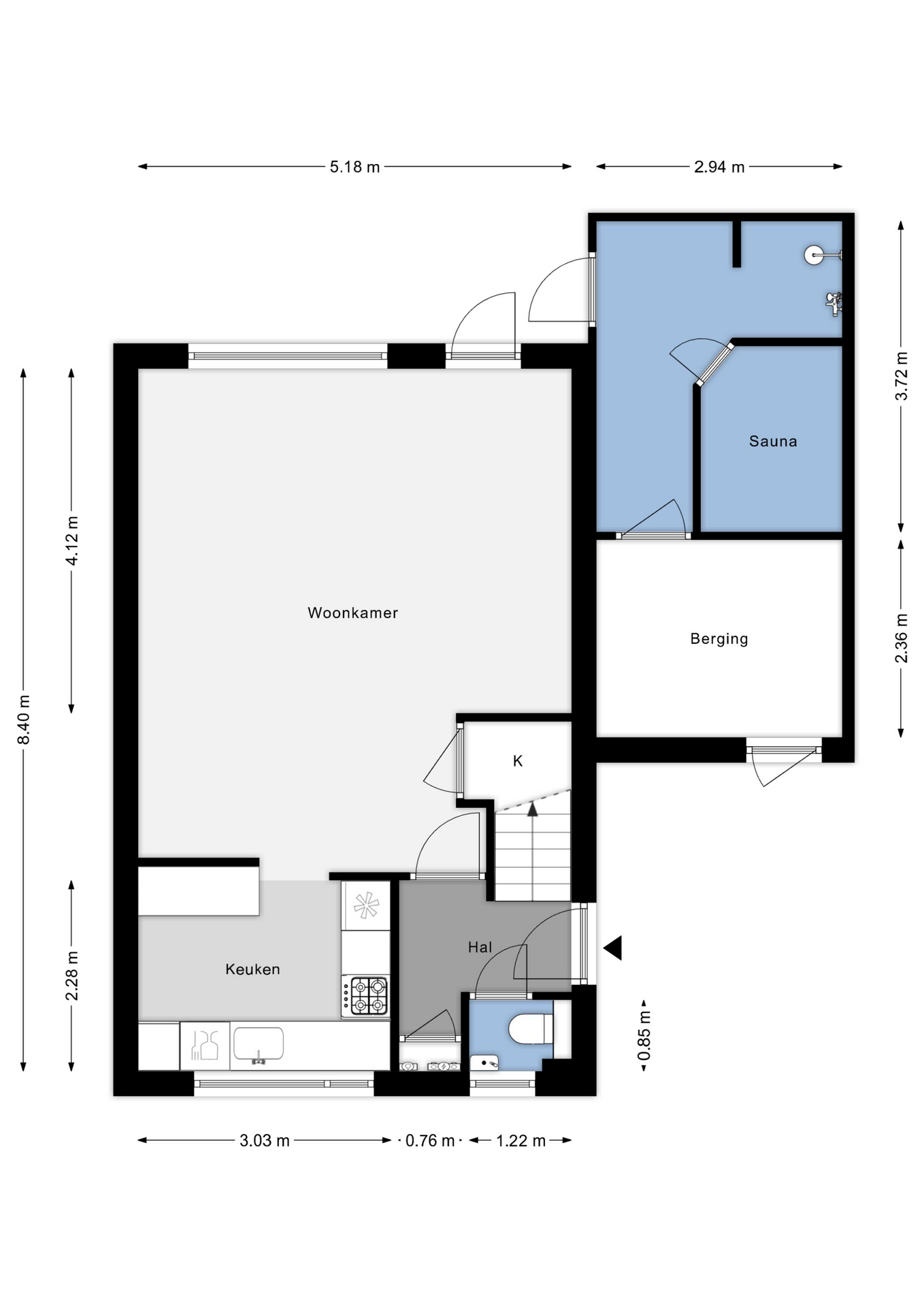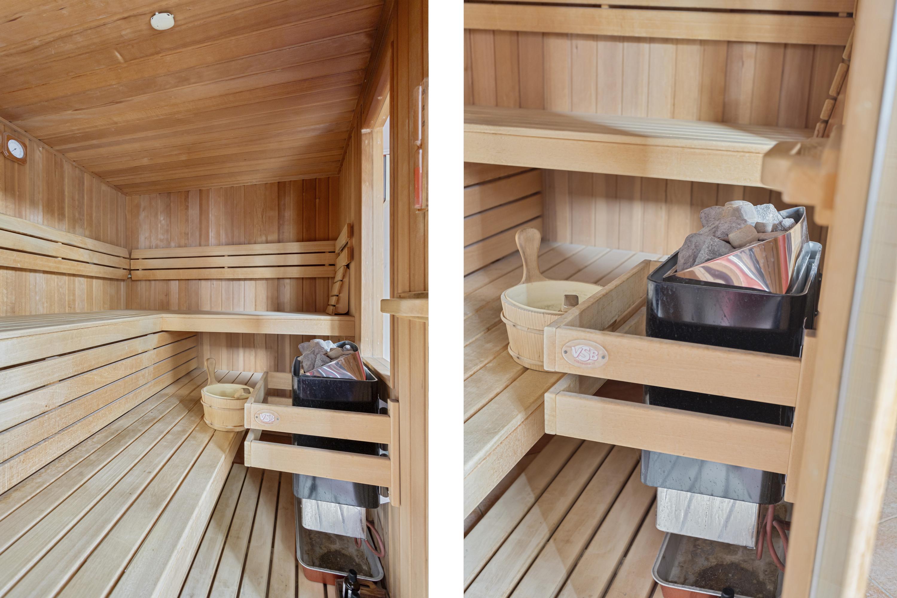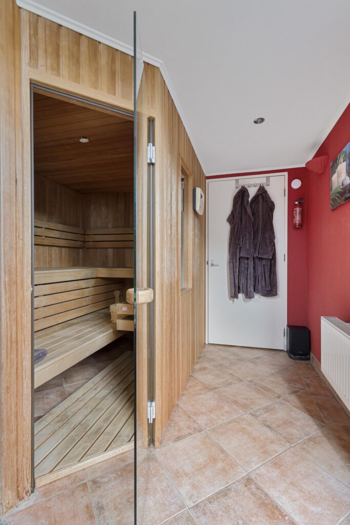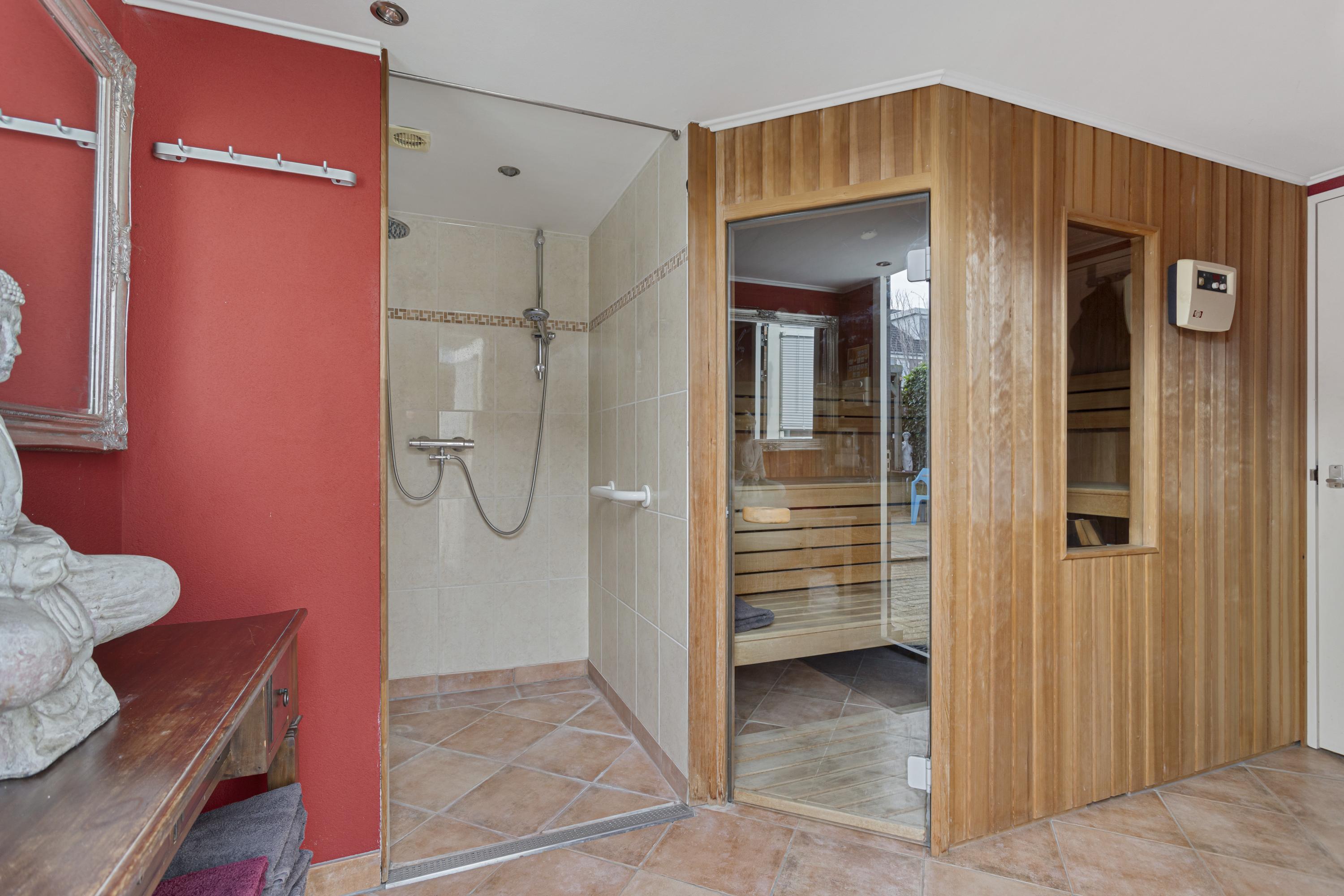 Vanuit de tuin is toegang tot de voormalig garage welke momenteel is opgesplitst in een wellness/sauna en een berging. De wellnessruimte beschikt over een ingebouwde finse sauna, dubbele (inloop) douche, inbouwspots, vloerverwarming en licht/electra. Vanuit deze ruimte is toegang tot de naastgelegen berging. Deze berging biedt veel opbergruimte, heeft ook vloerverwarmign en geeft middels een deur toegang tot de oprit aan de voorzijde.