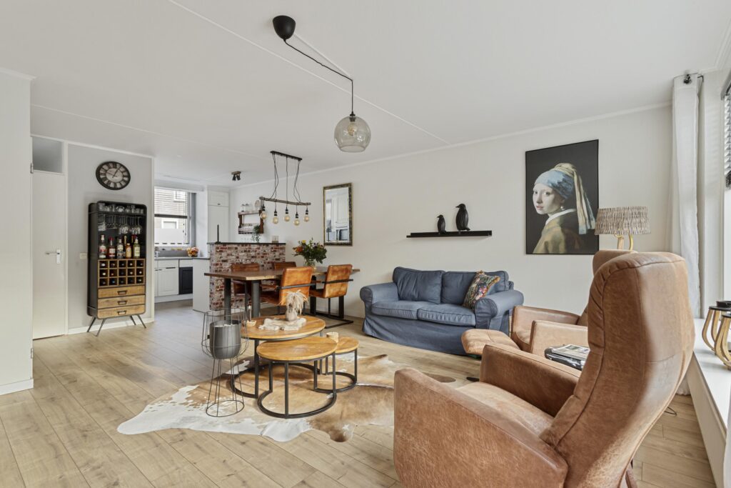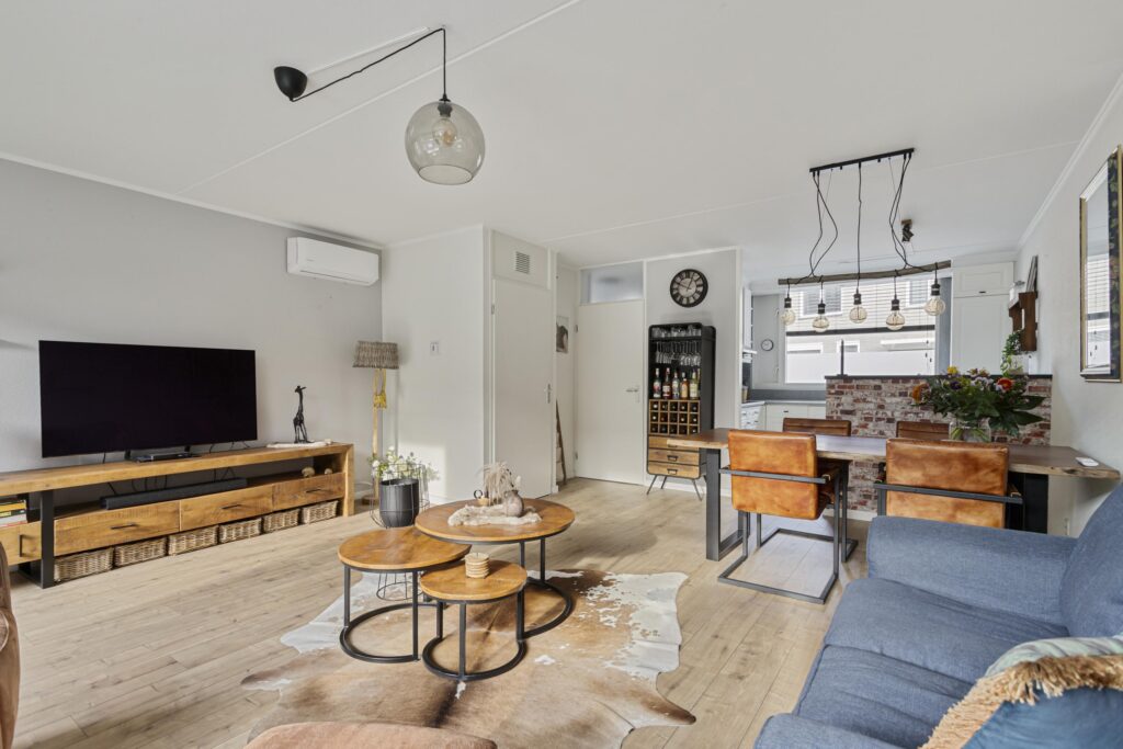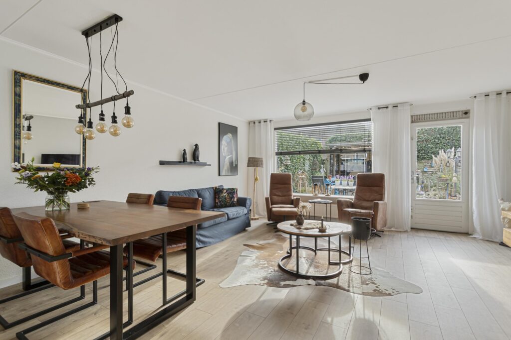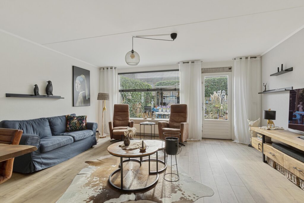 Ruime, lichte woonkamer (ca 32m²) met laminaatvloer, airconditioning (2025) en praktische vaste trapkast voor voldoende bergruimte. De woonkamer staat aan de achterzijde in direct tuincontact middels de tuindeur en aan de voorzijde in verbinding met de open keuken.