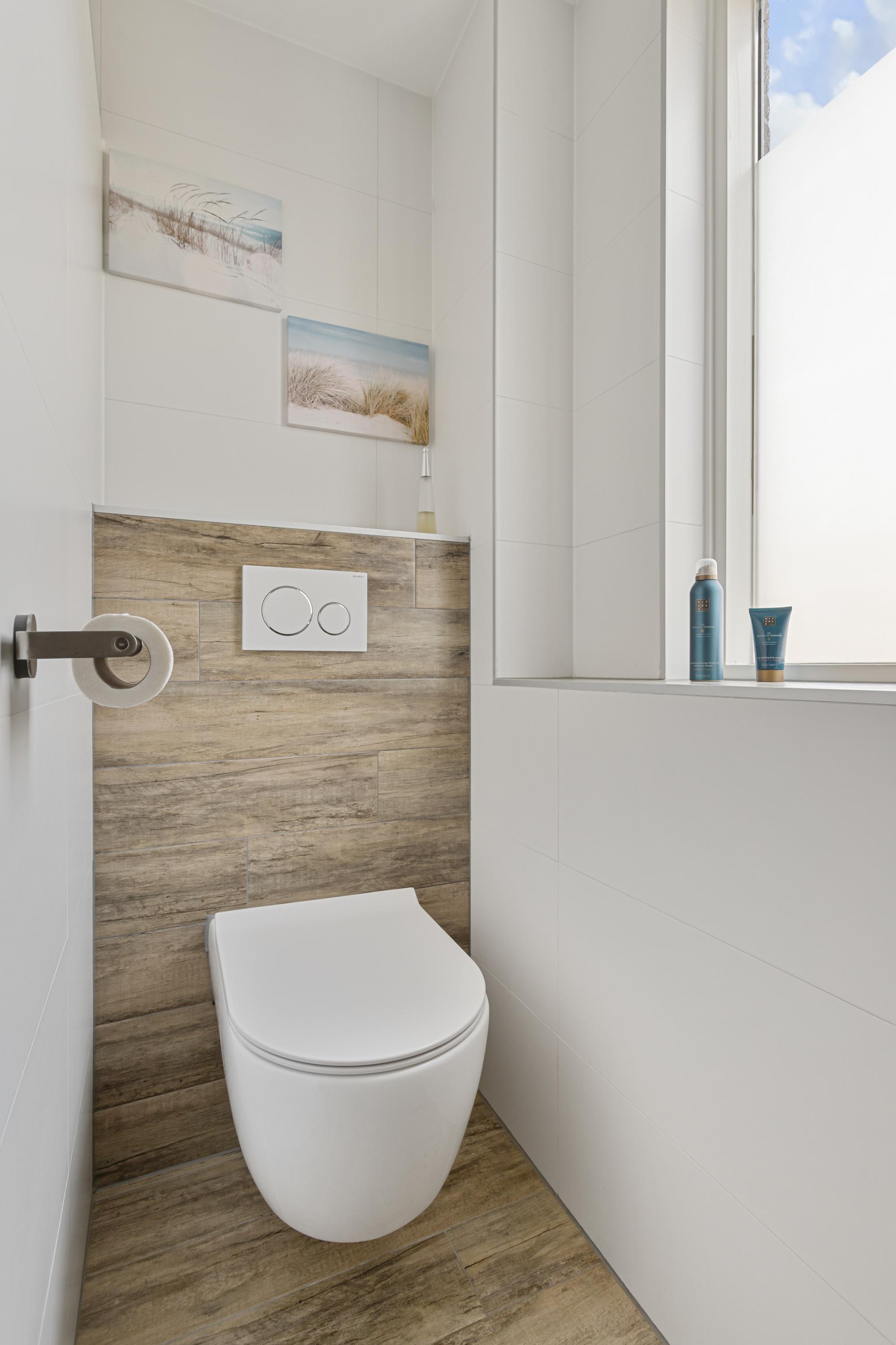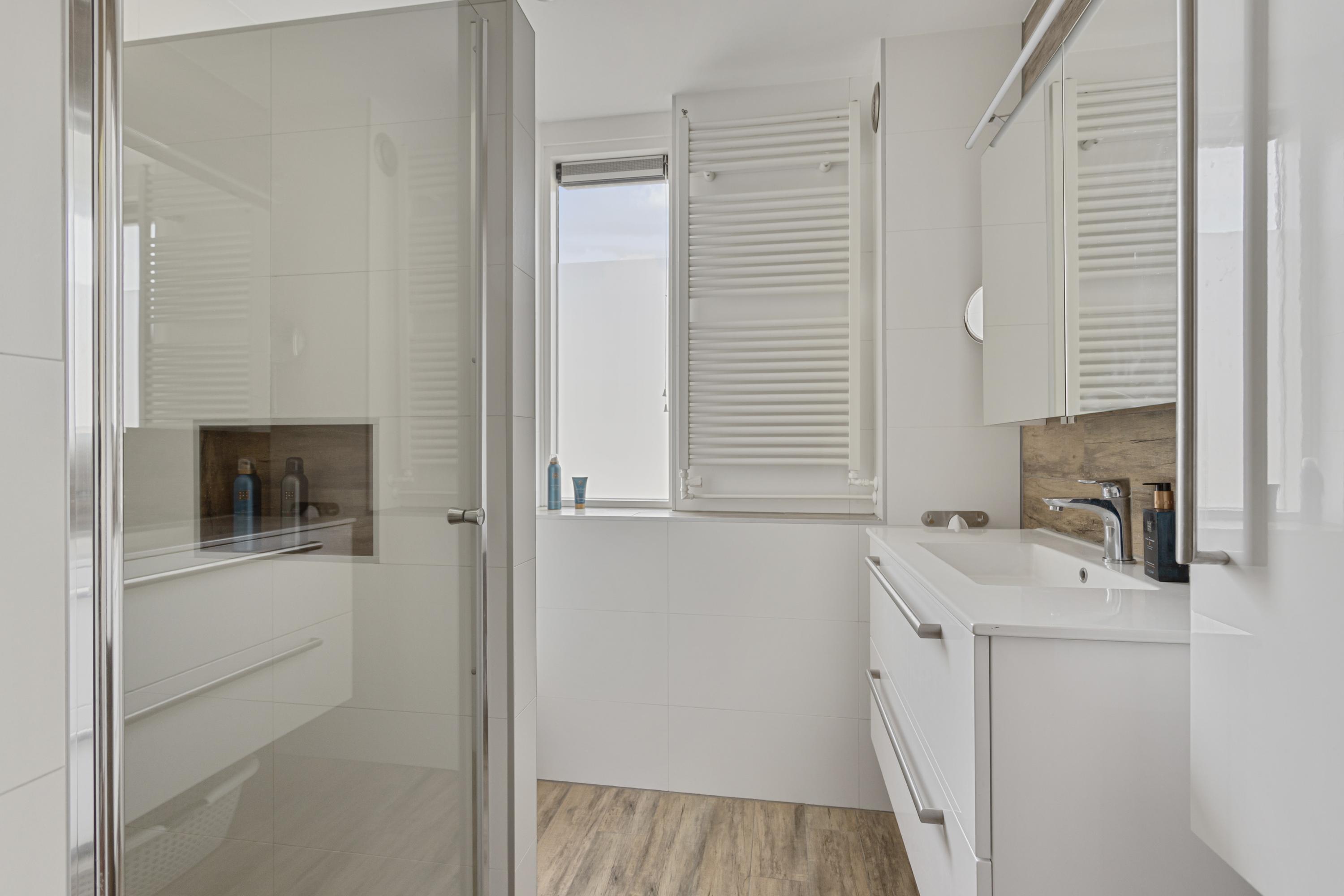 Moderne, geheel betegelde, badkamer gelegen aan de voorzijde van de woning en voorzien van wastafel met meubel,