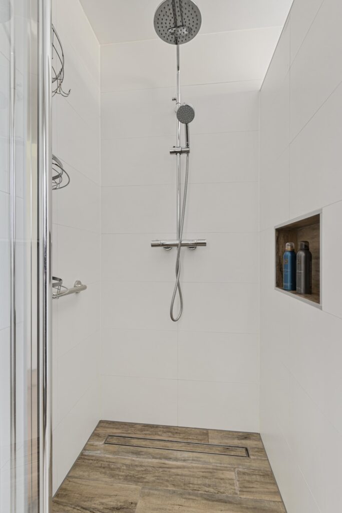 inloop (regen) douche met losse handdouche, vrijhangend closet, designradiator en inbouwspots.
