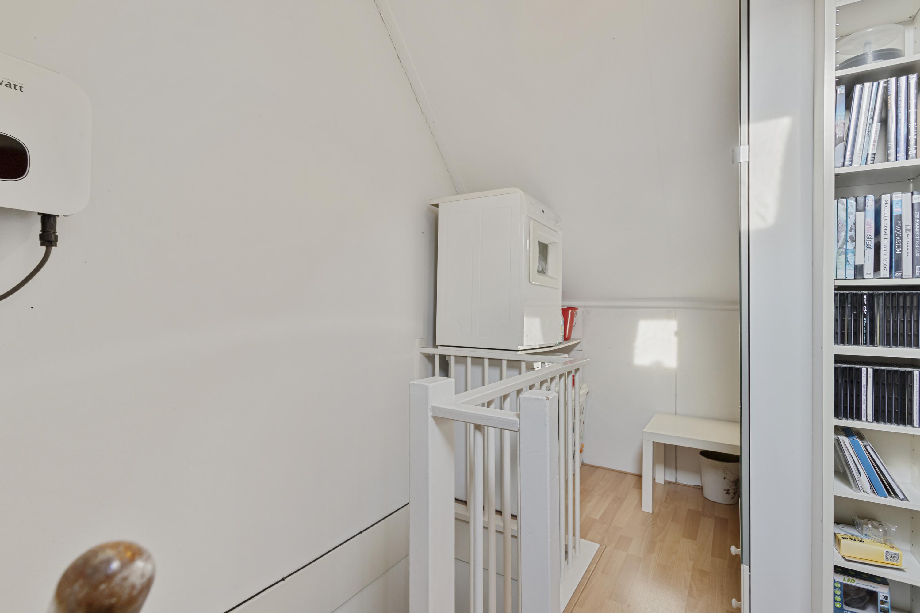 Overloop met de aansluitingen ten behoeve van de wasapparatuur, omvormer voor de zonnepanelen, bergruimte achter het knieschot, dakraam en toegang tot de 3e slaapkamer.
