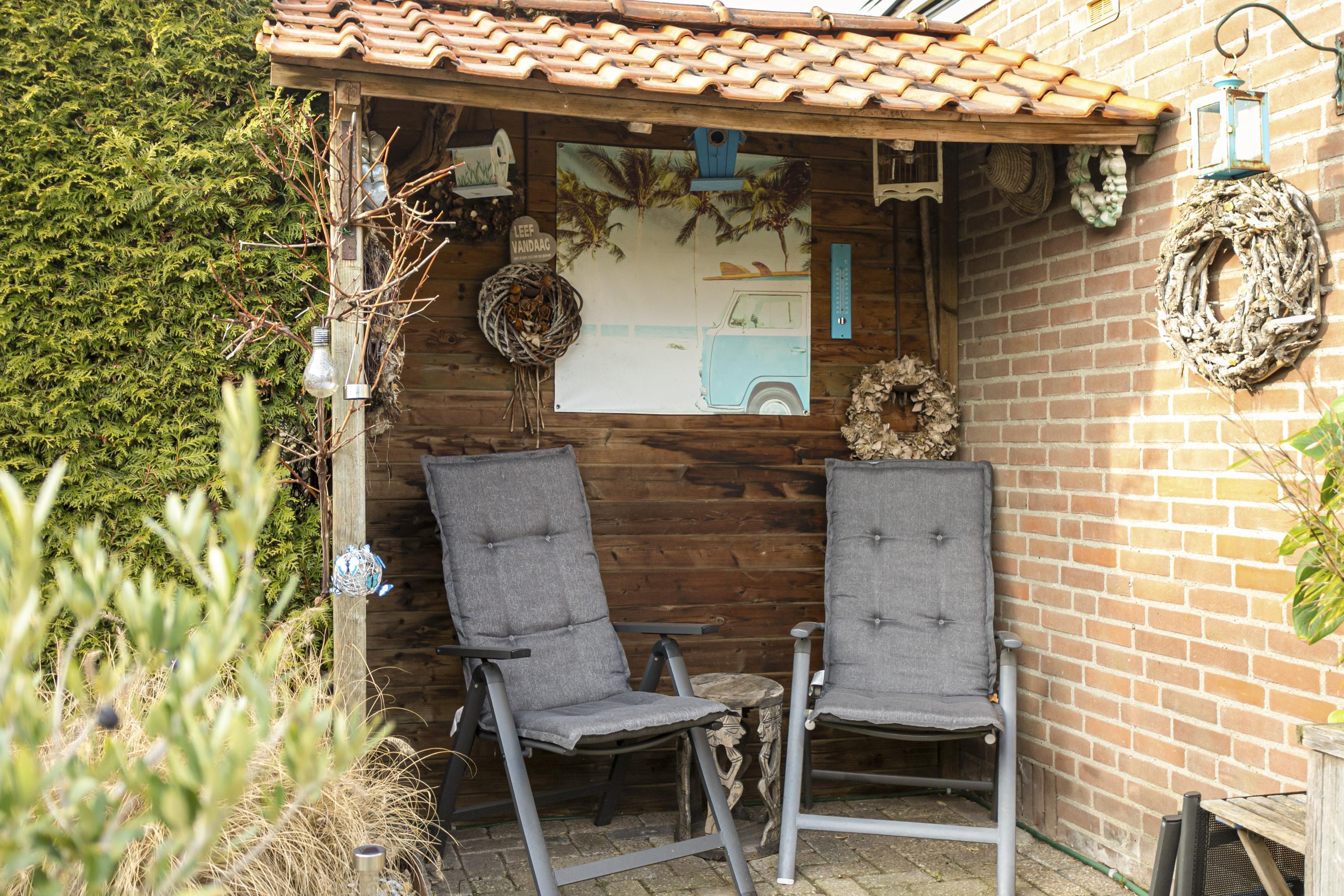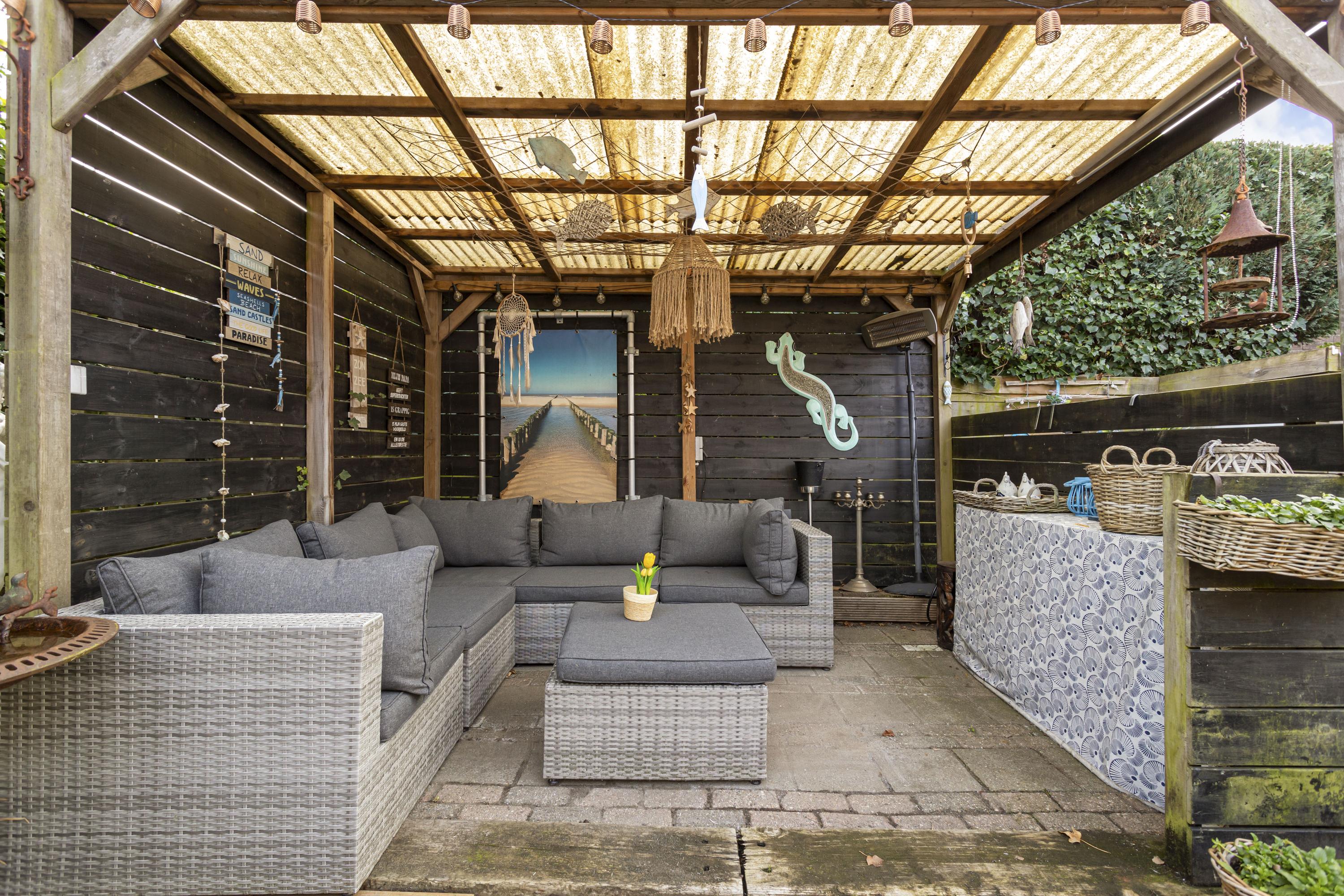 buitendouche, overkapping, waterkraan, praktische afscheiding voor de containers, een achterom en een (elektrisch bedienbaar) zonnescherm aan de achtergevel. Vanuit de tuin is daarnaast toegang tot de wellnessruimte en berging.