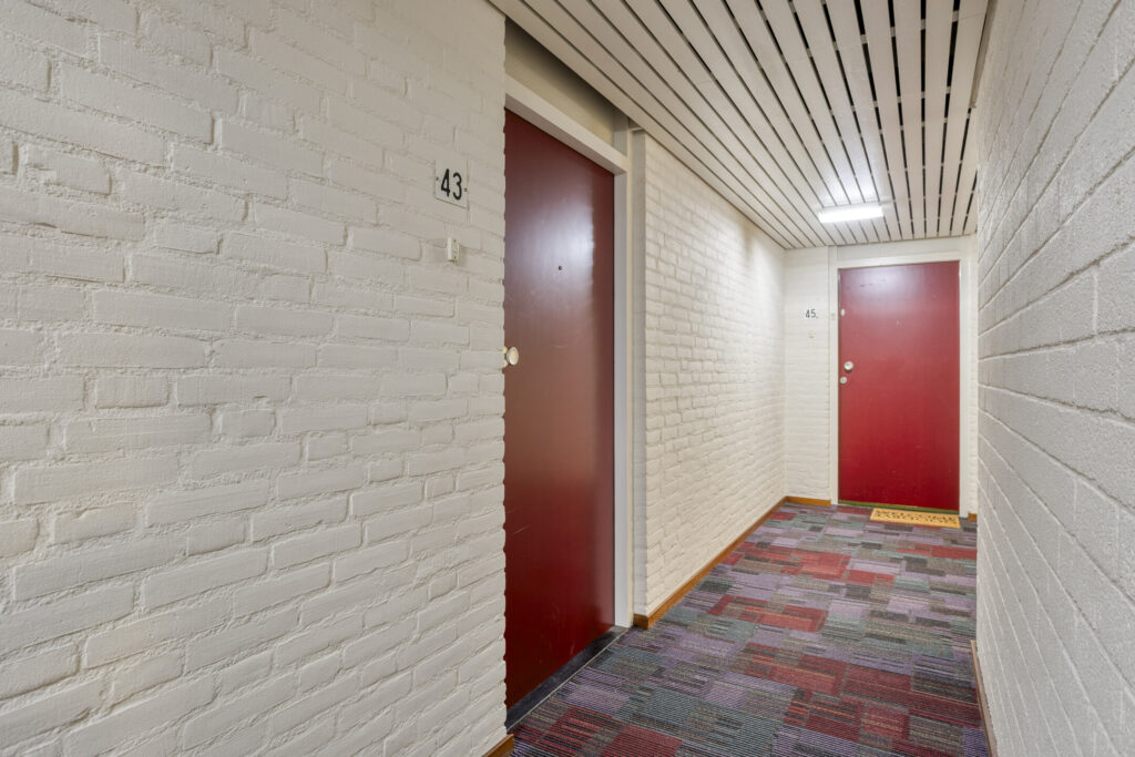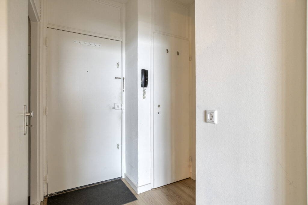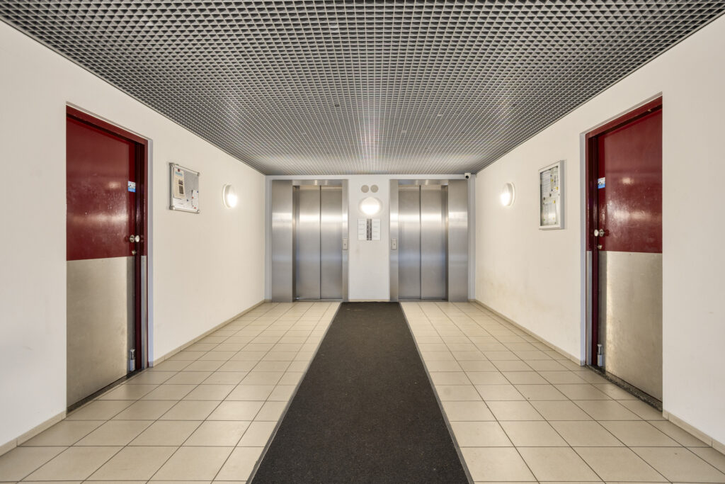 De hoofdentree met bellentableau en brievenbussen geeft toegang tot de centrale hal met liften. Via de lift of het trappenhuis is de 3e verdieping bereikbaar. Het portiek geeft toegang tot het appartement.