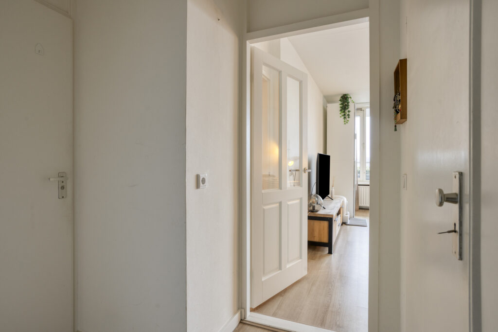 Bij binnenkomst in de hal zijn de badkamer, bergkast en woonkamer bereikbaar.