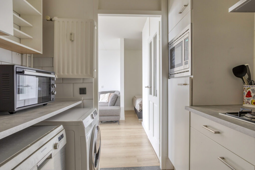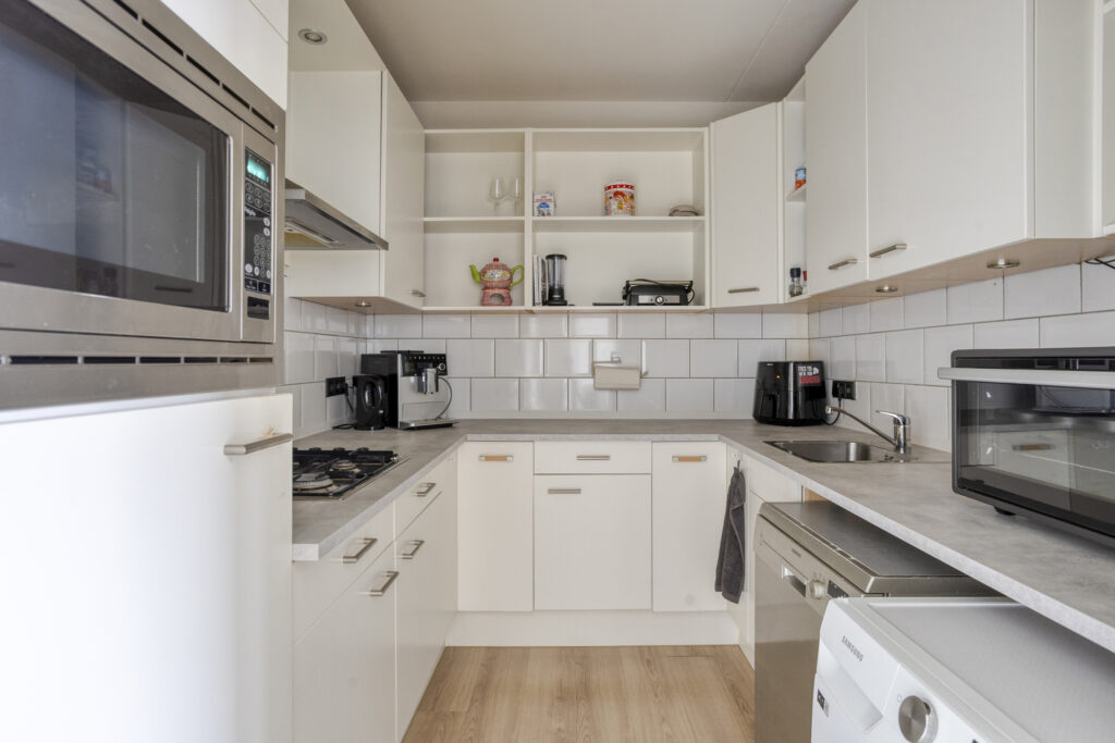 De woonkamer baadt in natuurlijk licht, wat zorgt voor een warme en uitnodigende sfeer. De keuken, een pronkstuk in U-opstelling, is uitgerust met alle apparatuur die je nodig hebt om je culinaire kunsten te vertonen. Tevens beschikt de keuken over een wasmachineaansluiting.