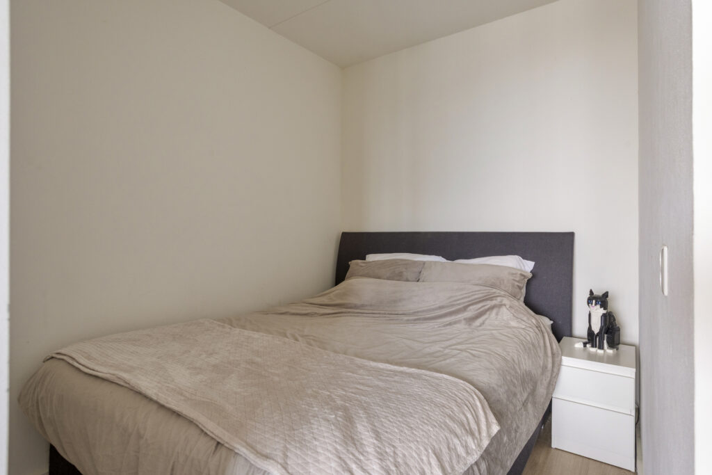De slaapkamer is bereikbaar vanuit de woonkamer en beschikt over een laminaatvloer.