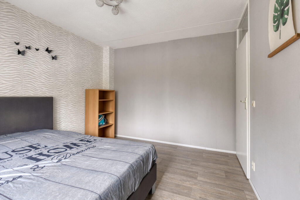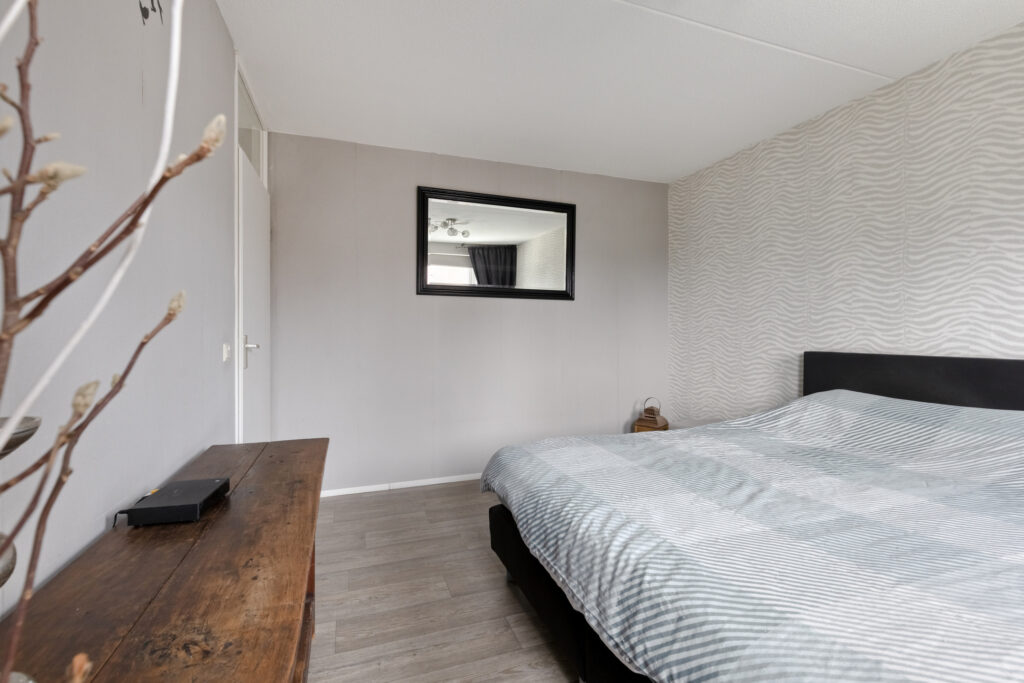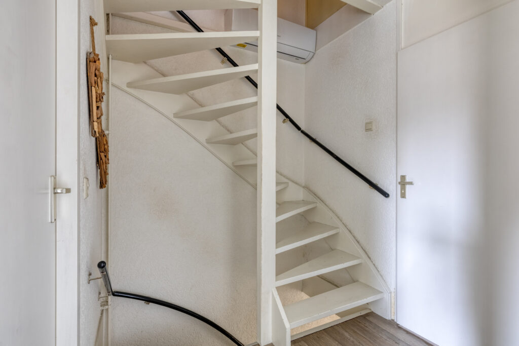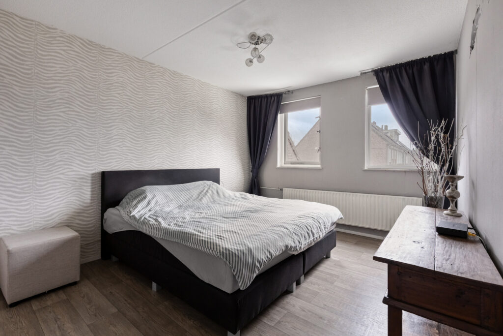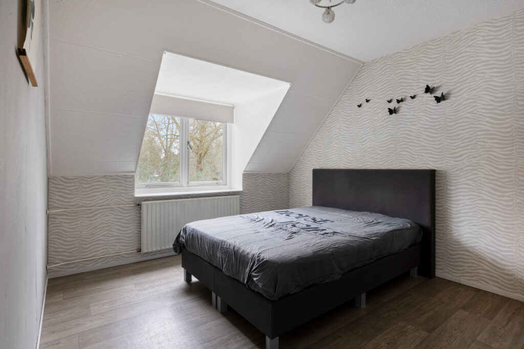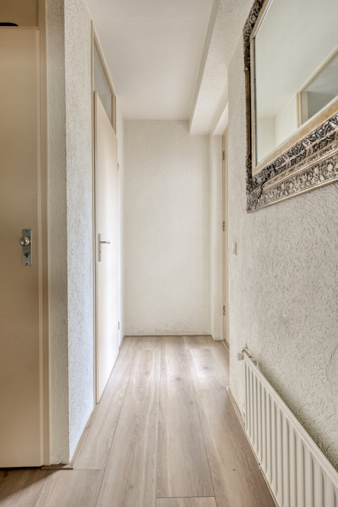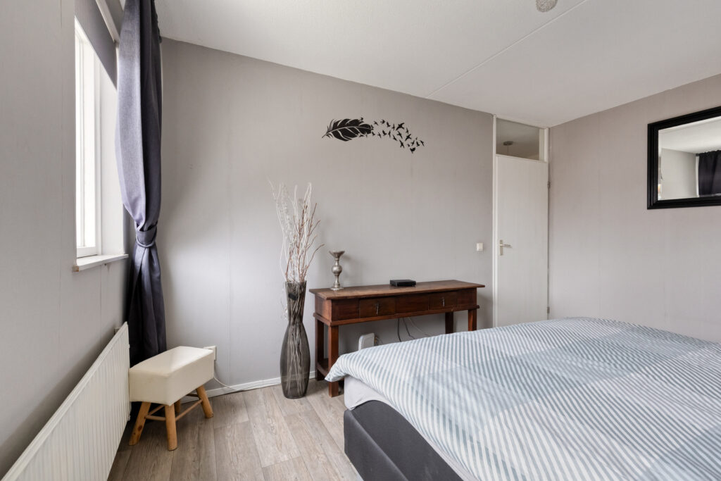 1e Verdieping: overloop met vinylvloer die in de slaapkamers is doorgelegd: slaapkamer 1 aan de achterzijde van plm. 13,5 m2; slaapkamer 2 aan de achterzijde van plm. 7 m2 die momenteel als kastenkamer in gebruik is; slaapkamer 3 aan de voorzijde van het huis van plm.12 m2; gemoderniseerde badkamer met een fijne inloopdouche, een flink badkamermeubel met wastafel en een 2e toilet. Op de overloop in het trapgat is een airco unit geplaatst.