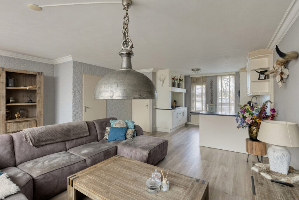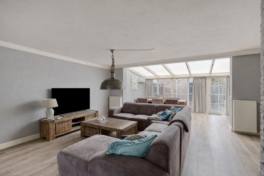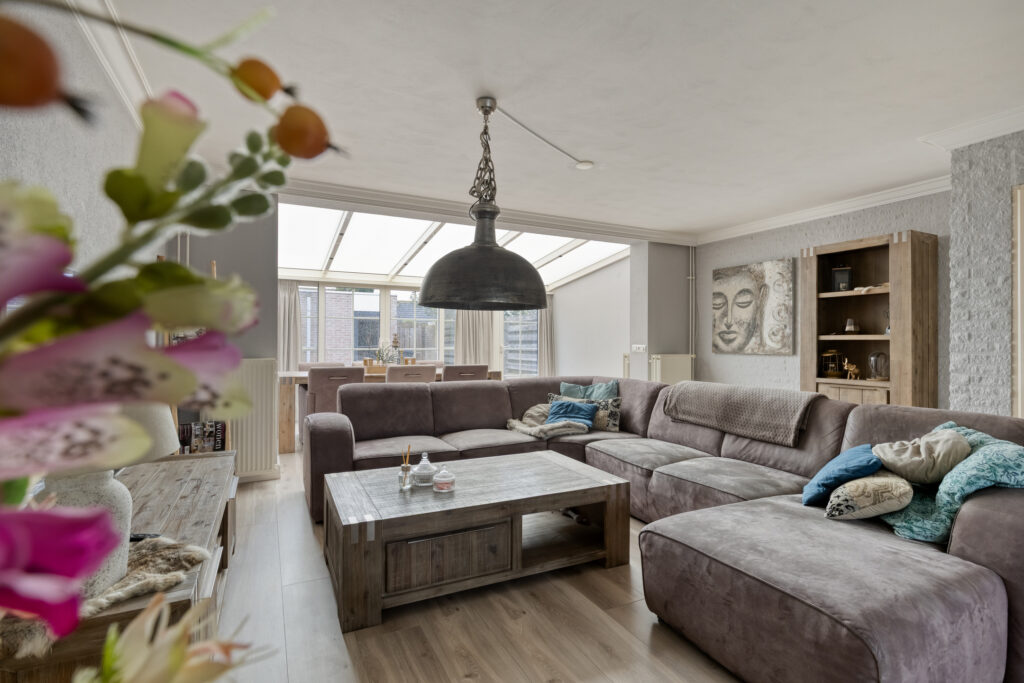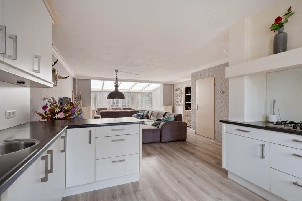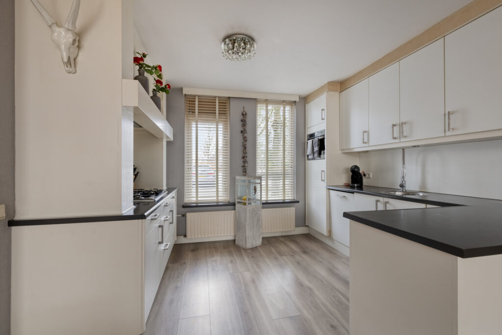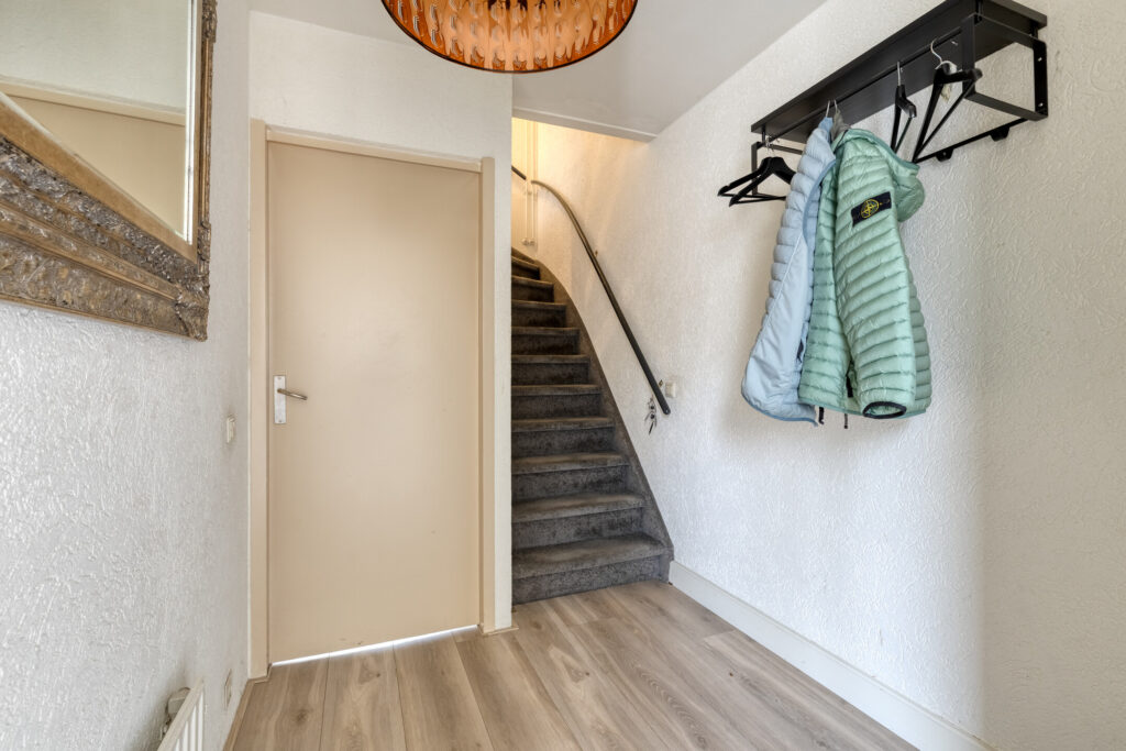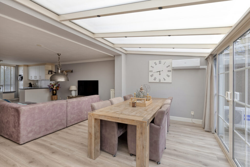 Begane grond:hal met laminaatvloer die over de gehele begane grond is doorgelegd; geheel betegeld toilet met hangcloset; meterkast; riante living bestaande uit de woonkamer van 40m2 ne keuken van 10 m2. De open keuken ligt aan de voorzijde van het huis en heeft een uitgebreide keukeninrichting in een hoekopstelling met onder meer de koelkast, combi oven, spoelbak plus een extra werkblad met de gaskookplaat en afzuigkap. Verder biedt de keuken veel werk- en kast en laderuimte en is er een aansluiting voor een inbouw vaatwasser. De woonkamer is op de tuin georiënteerd en heeft een serre uitbouw met schuifpui waardoor binnen en buiten op een plezierige manier verbonden zijn en er veel daglicht binnen komt. De airco unit is een fijne toevoeging om zomers te koelen en in de winter te verwarmen. Verder is er een praktische bergkast onder de trap.
