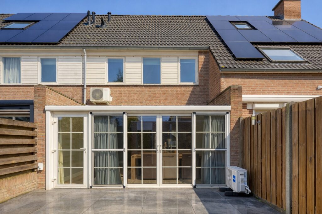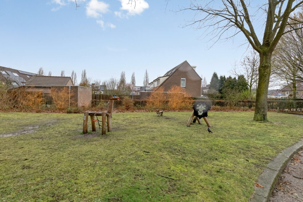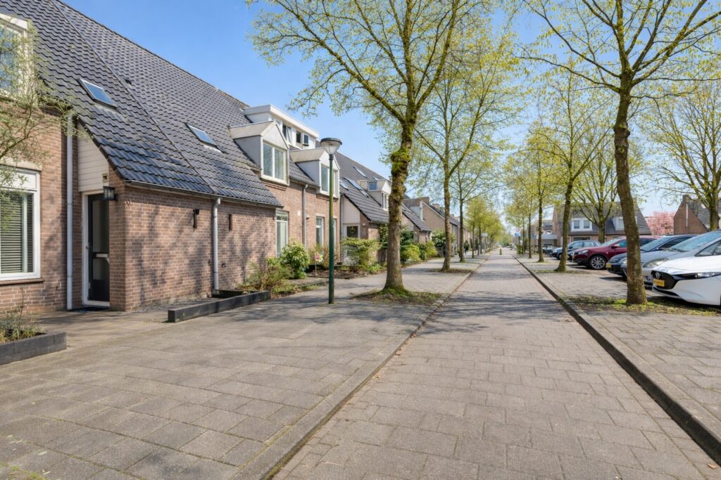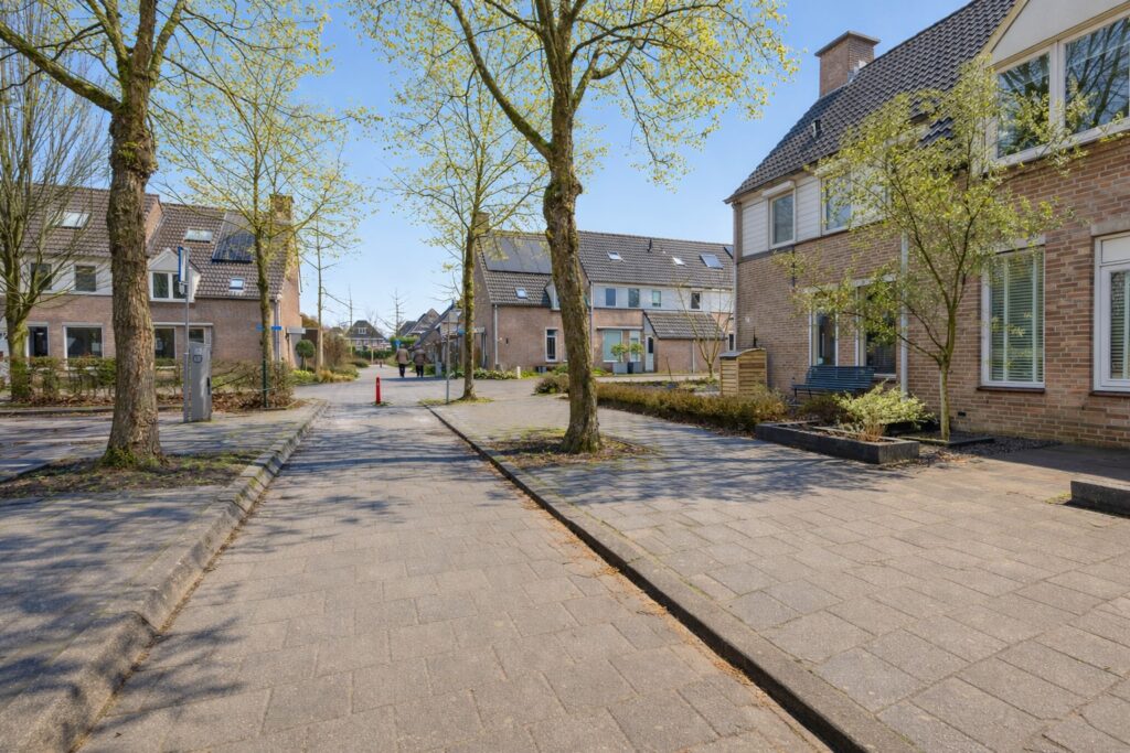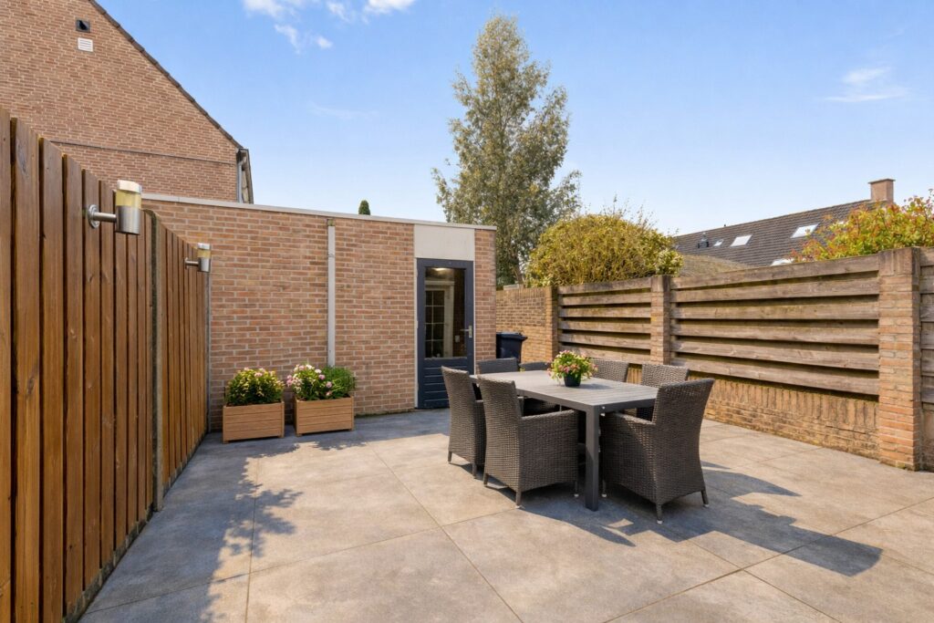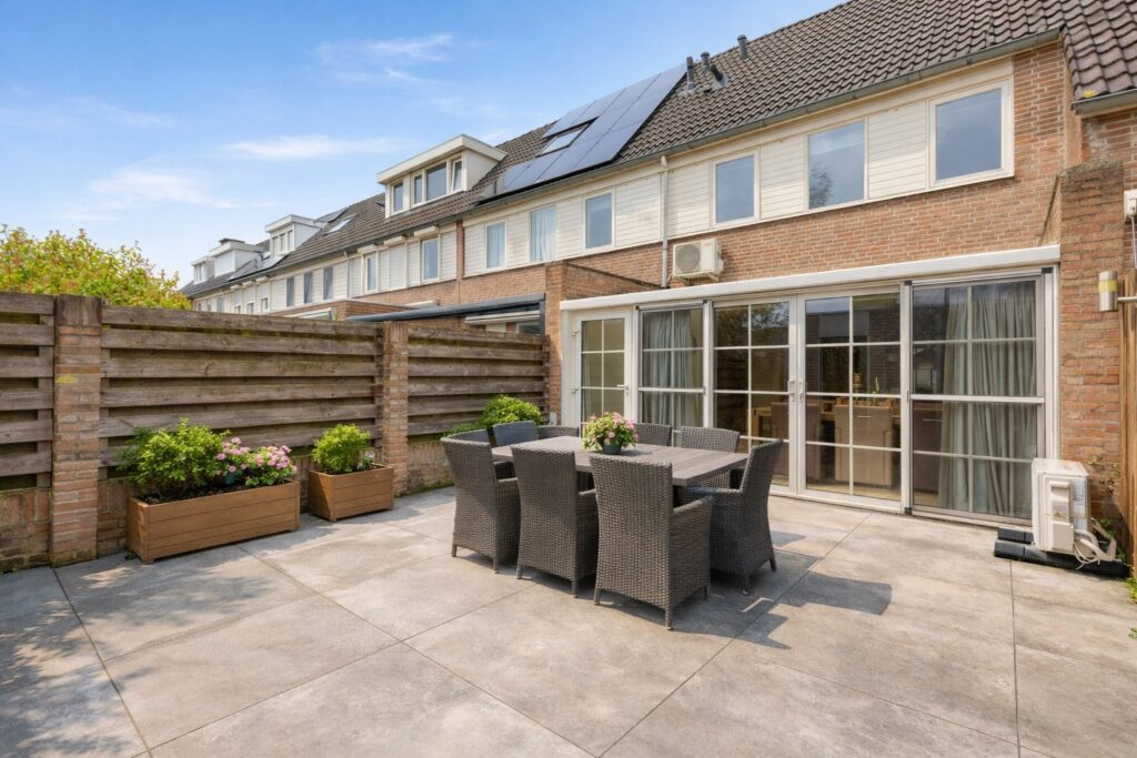 Tuin: de achtertuin ligt pal op het zonnige zuiden en is onderhoudsarm aangelegd met grote terrastegels. Met plantenbakken en een tuinset heb je een heerlijke buiten plek om te genieten zeker in combinatie met de grote schuifpui naar de woning. Achter in de tuin staat de stenen berging die ook van elektra is voorzien. En via de poort en achterom bereik je de straat.