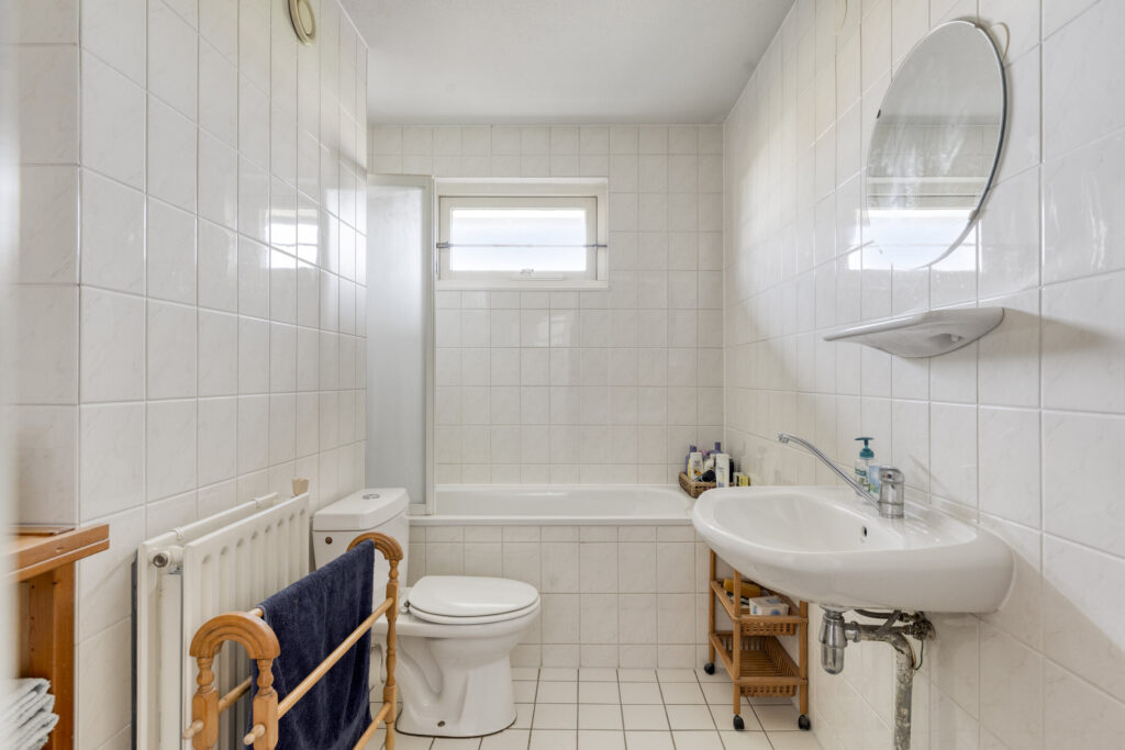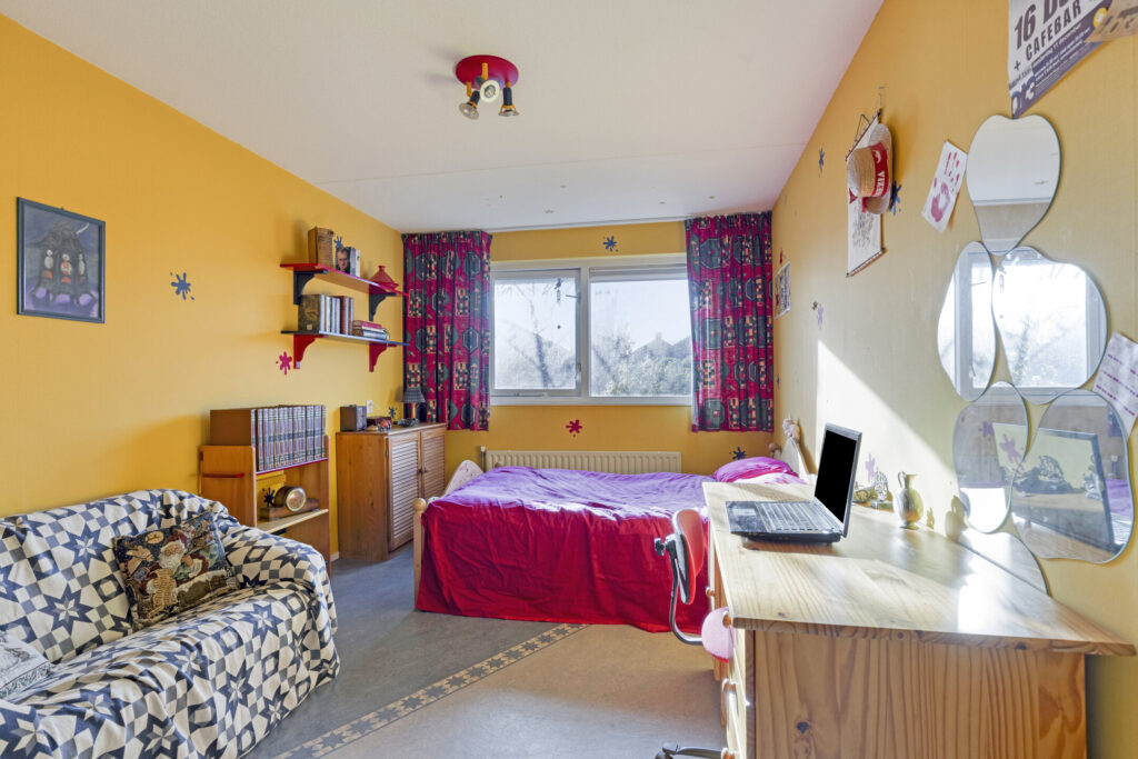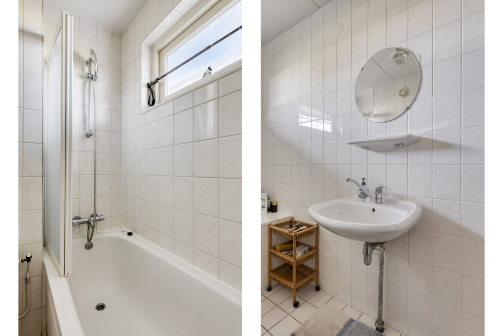 Ruime overloop met toegang tot de drie slaapkamers van respectievelijk ca. 11 m², 13 m² en 15 m². Geheel betegelde badkamer met ligbad, tweede toilet en een wastafel.