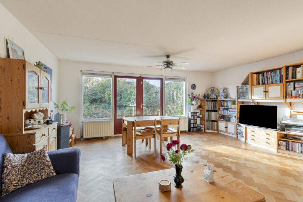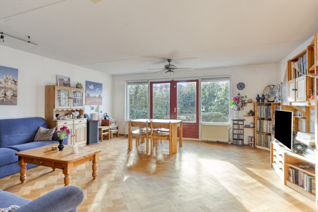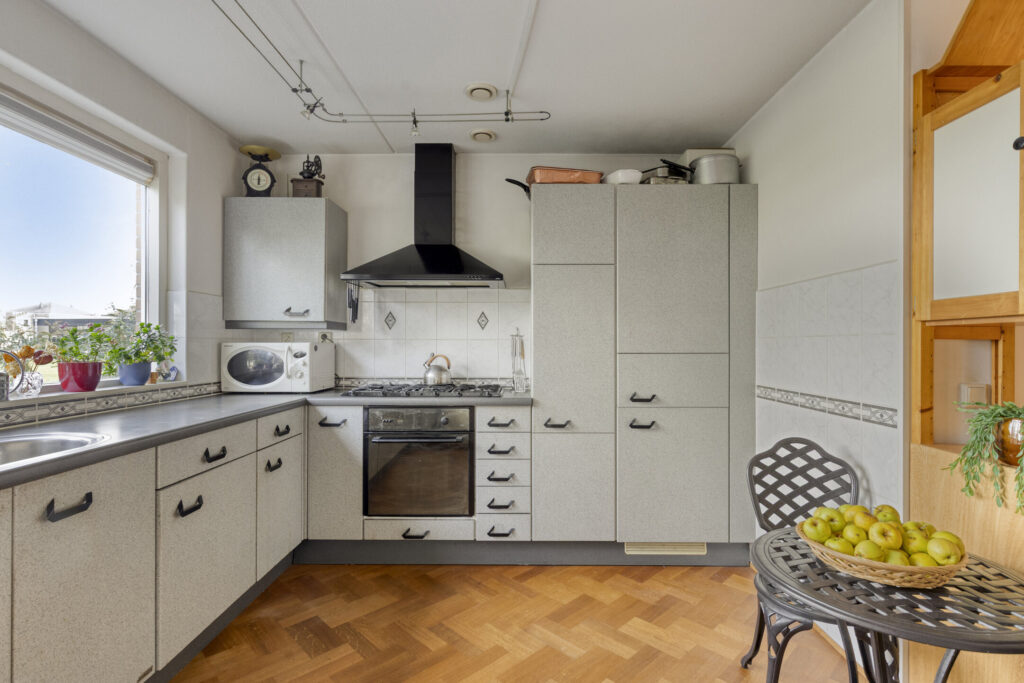 Entree/hal met meterkast, toiletruimte en toegang tot de woonkamer. De woonkamer van ca. 40 m² is voorzien van een parketvloer en dubbele openslaande deuren naar de tuin. De royale keuken met uitzicht op het groen, van ca 12 m² is geplaatst in een L-opstelling en is uitgerust met diverse inbouwapparatuur.