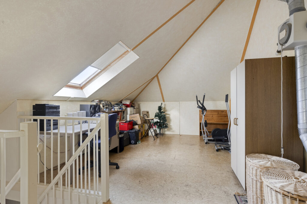 Zolderruimte voorzien van een dakraam, wasmachineaansluiting, knieschotten en de opstelplaats voor de CV-ketel.