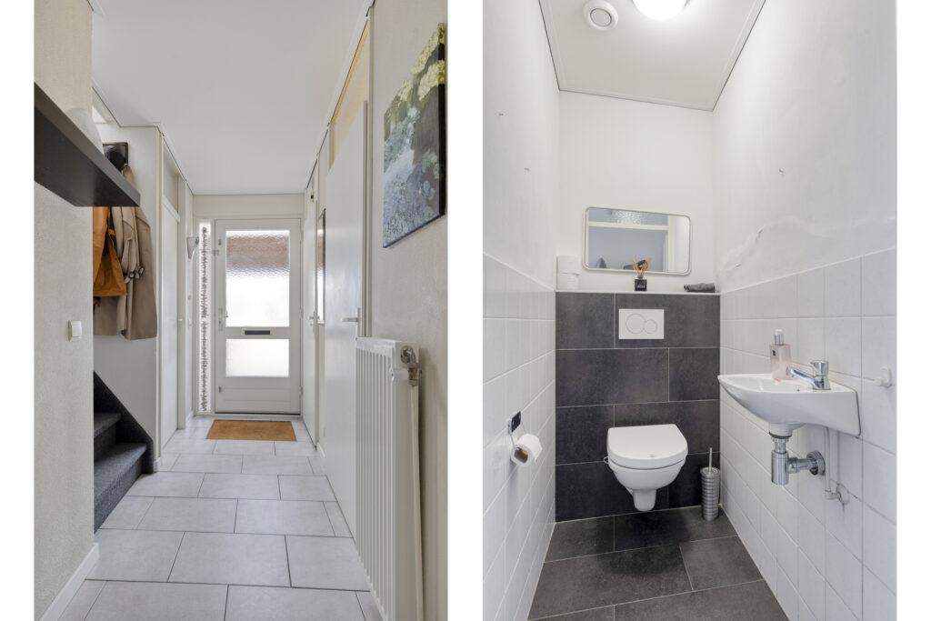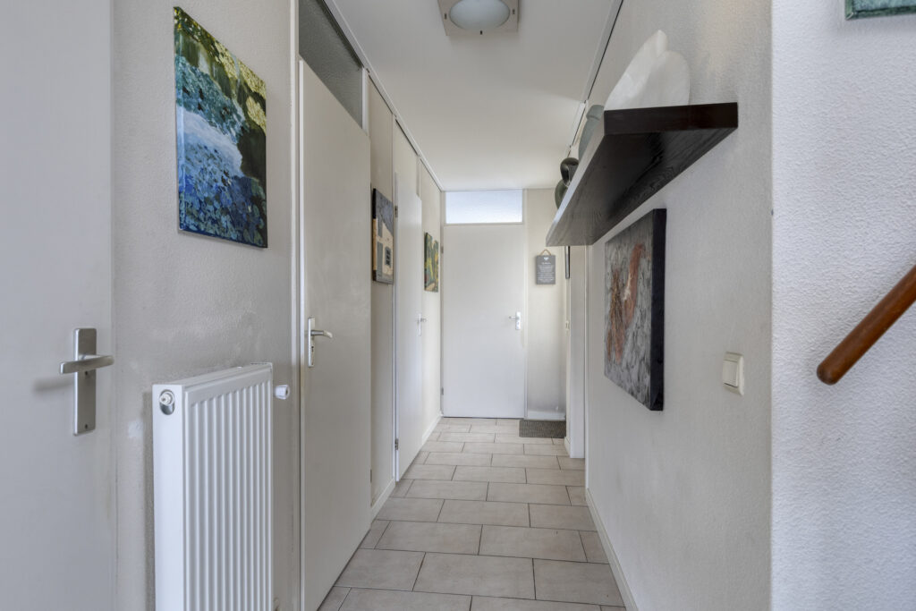 Voorzien van tegelvloer en trapopgang naar de 1e verdieping, hal met toegang tot wasruimte/berging, woonkamer, toiletruimte, badkamer, slaapkamer en deur naar de achtertuin.