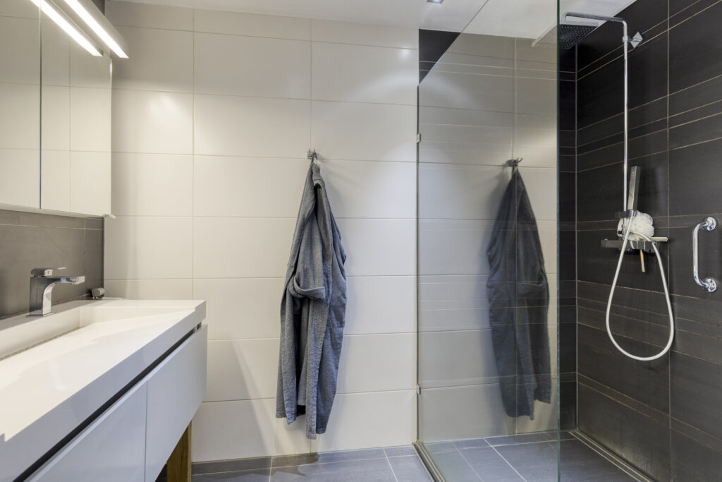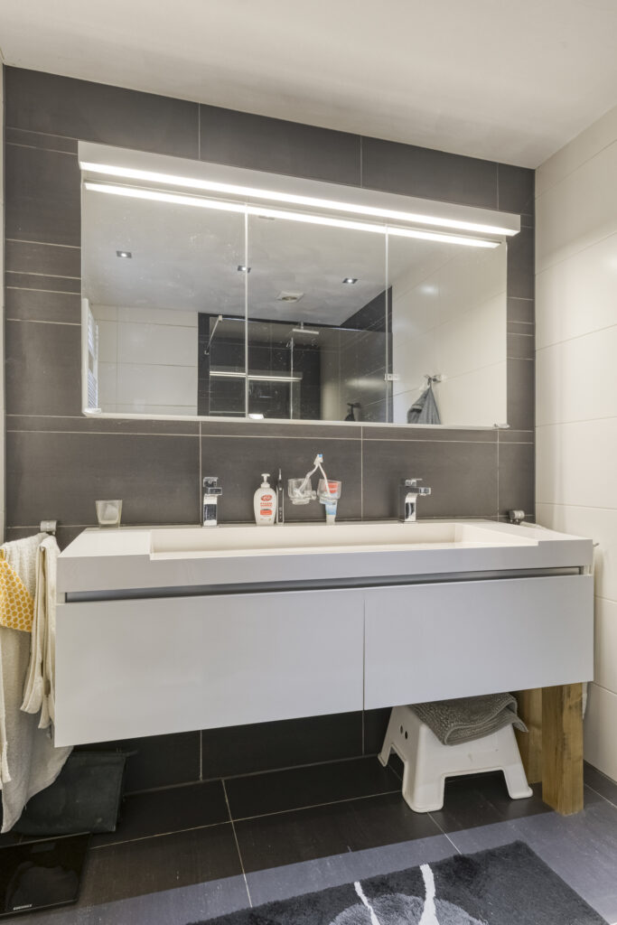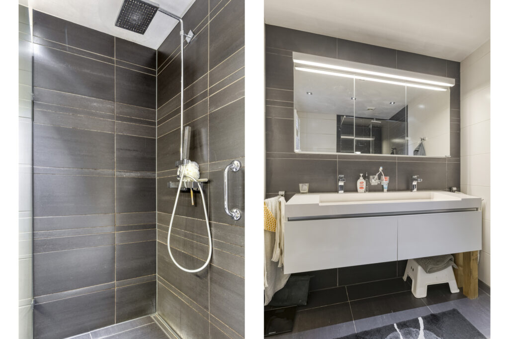 Fraaie badkamer (ca. 2010) met luxe wand en vloertegels en geen dorpels (dus rolstoelvriendelijk) is voorzien van een grote inloopdouche en dubbele wastafelmeubel met veel bergruimte.