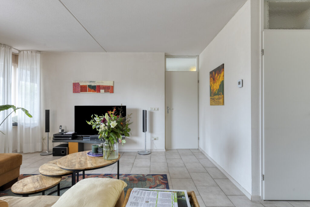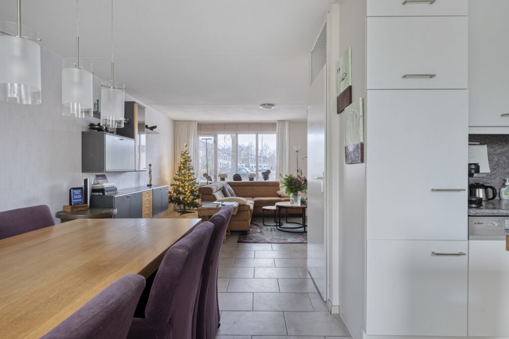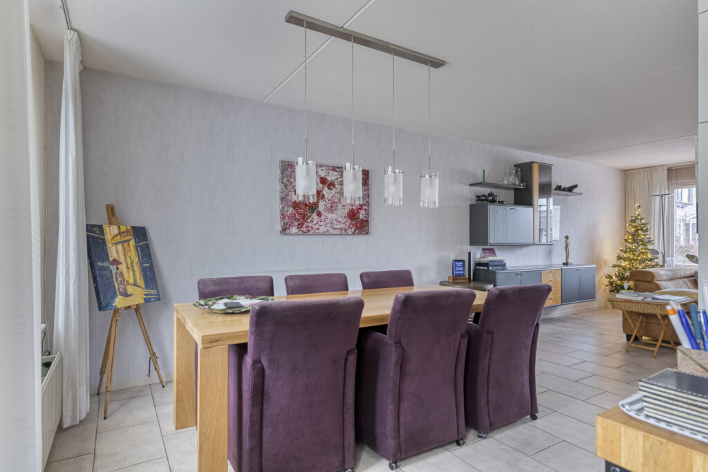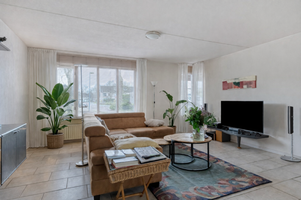 L-vormige ruime woonkamer van ca. 47 m² (incl eetgedeelte) voorzien van tegelvloer, veel lichtinval, stucwerk wanden en plafonds en een praktische trap-/bergkast.