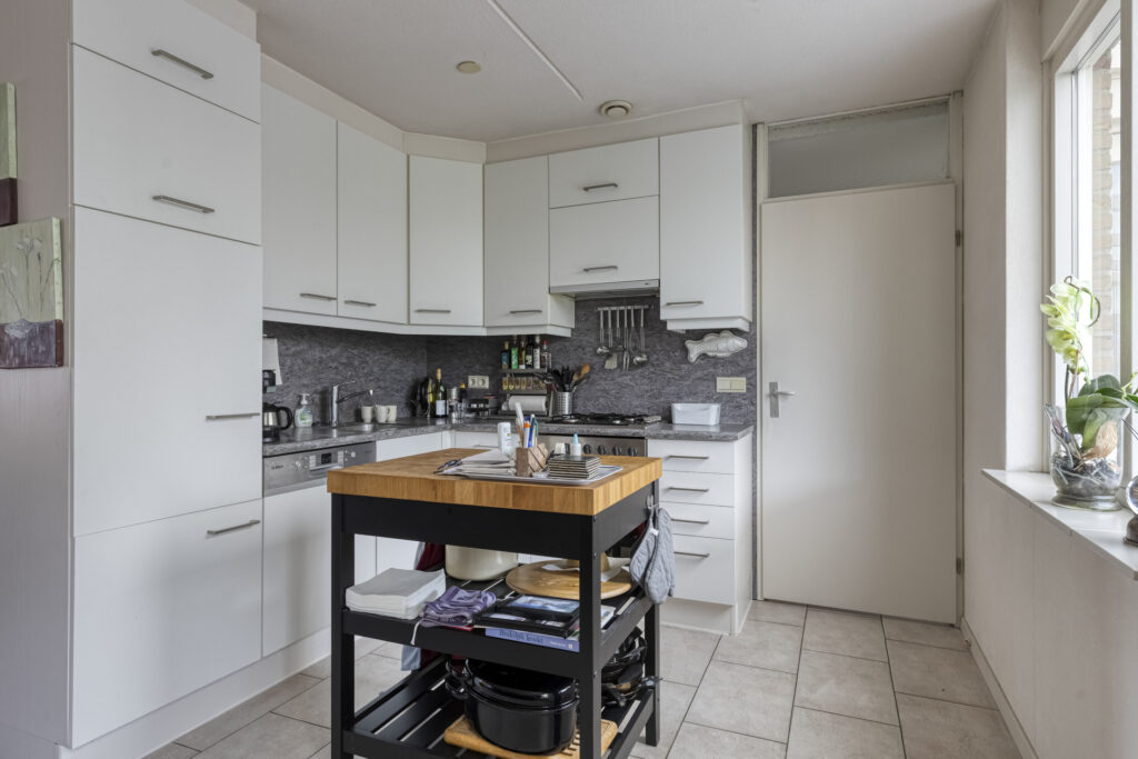 Open keuken (1993) met hoekopstelling voorzien van diverse hoge kastjes en lades, gaskookplaat, inbouwafzuigkap, koel-/ vriescombinatie, kast en oven. Eveneens te bereiken vanuit de hal.