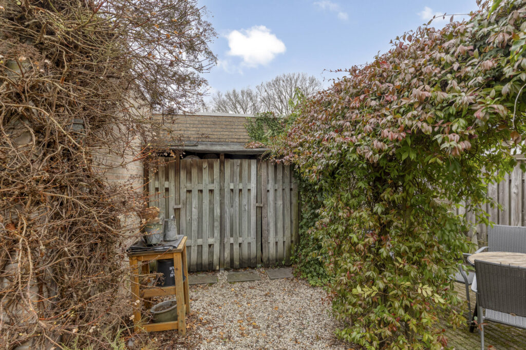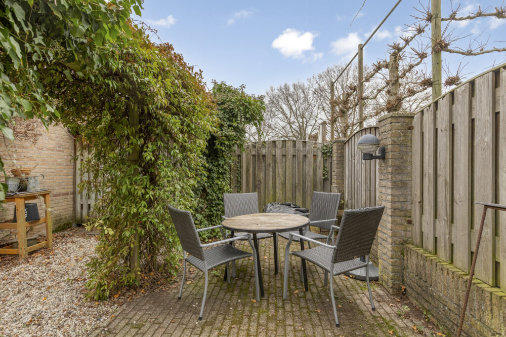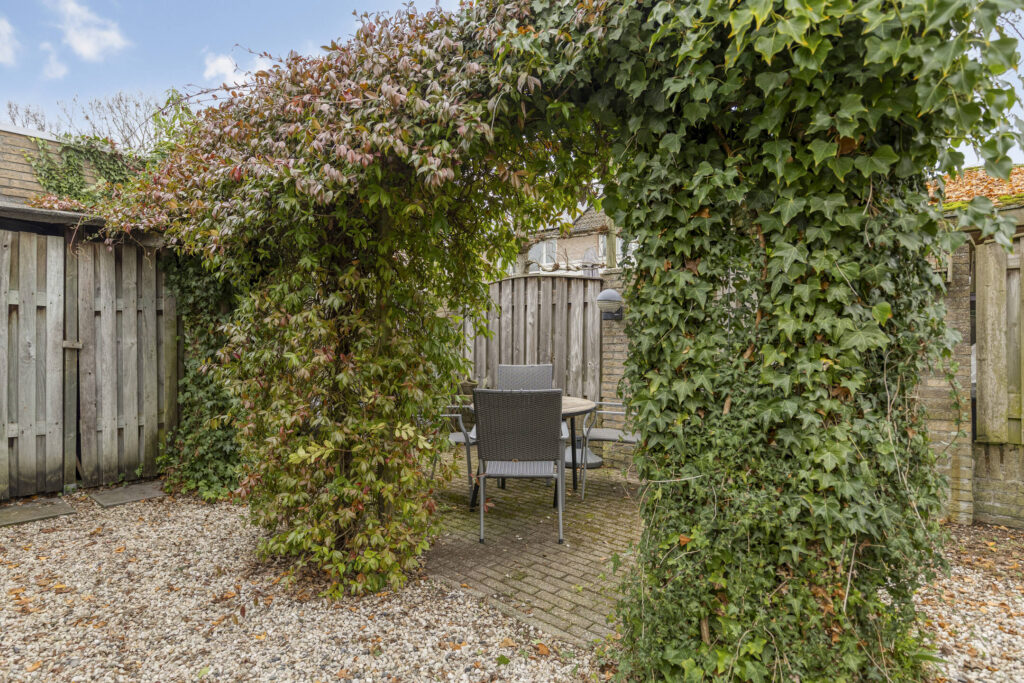 Aangelegde grotendeels bestrate onderhoudsvriendelijke achtertuin met diverse borders en plantenbakken gesitueerd op het noordoosten. Overdekt terras (overkapping) en poort naar achterom.