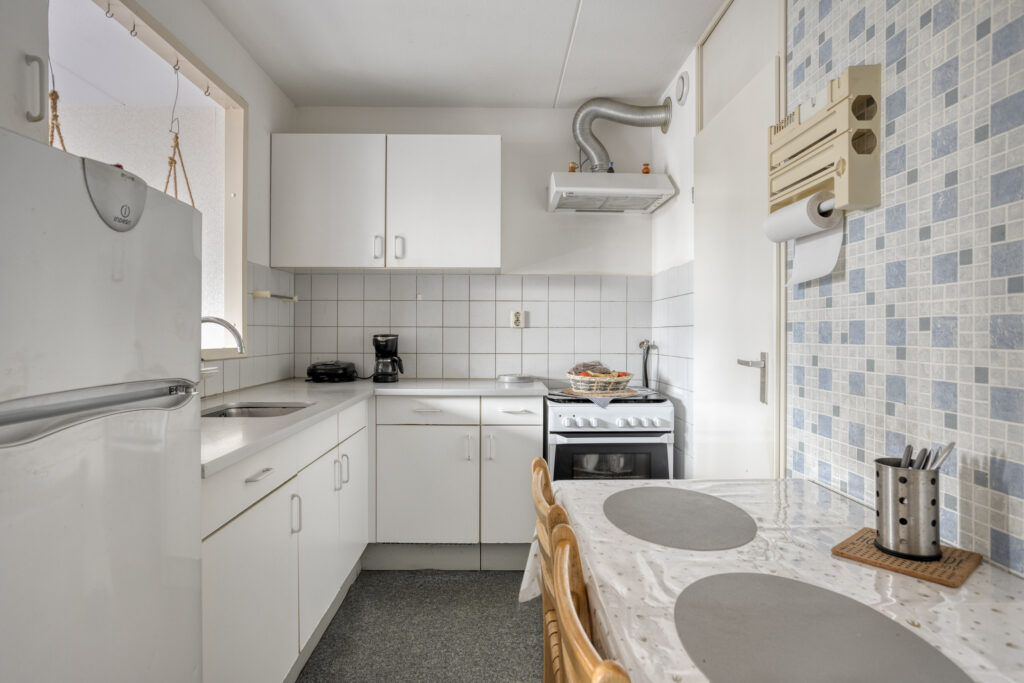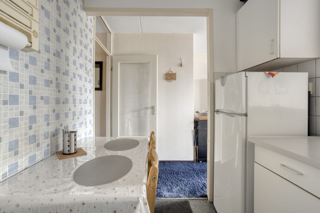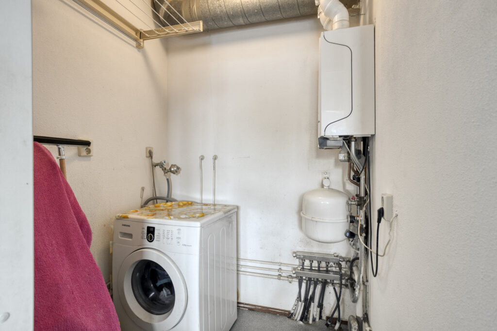 Aan de keuken zit een praktische bijkeuken voorzien van bergruimte, cv-ketel en een wasmachineaansluiting.
