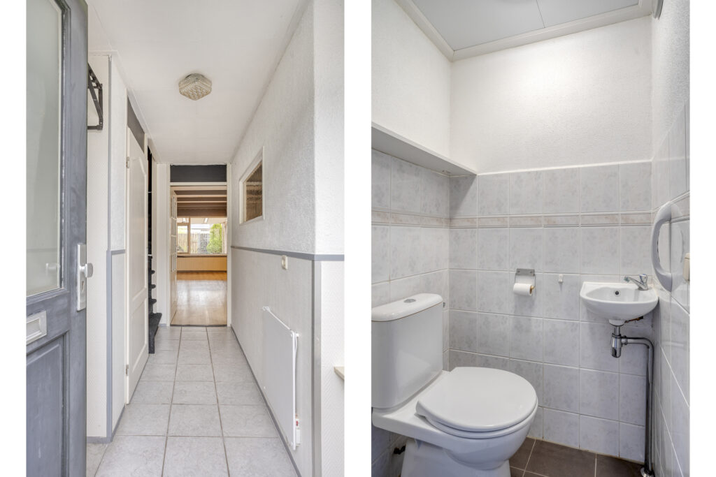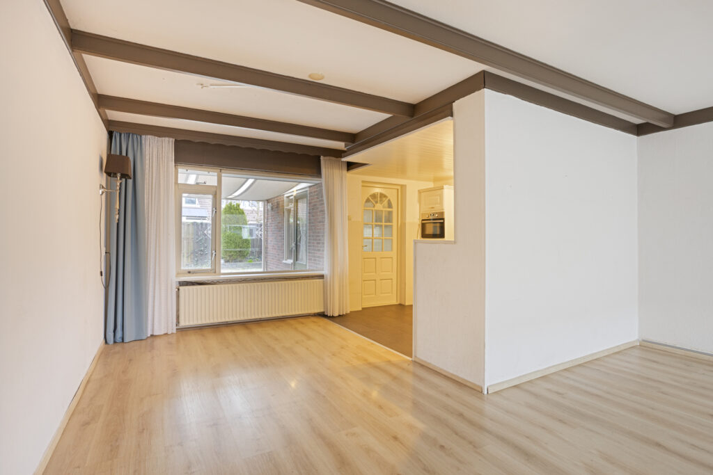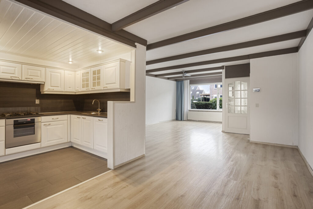 Bij binnenkomst kom je op de begane grond in de lichte woonkamer, een comfortabele leefruimte waar je je direct thuis voelt. De open keuken sluit hier naadloos op aan en is voorzien van diverse inbouwapparatuur, waardoor koken en samenzijn moeiteloos samengaan. Vanuit de keuken heb je toegang tot de praktische bijkeuken/berging en loop je zo door naar de achtertuin, een fijne plek om te ontspannen of te genieten van het buitenleven. Op de begane grond bevindt zich tevens een toilet met fontein. De woning is volledig voorzien van betonnen begane grond- en verdiepingsvloeren, wat bijdraagt aan het solide karakter en wooncomfort.