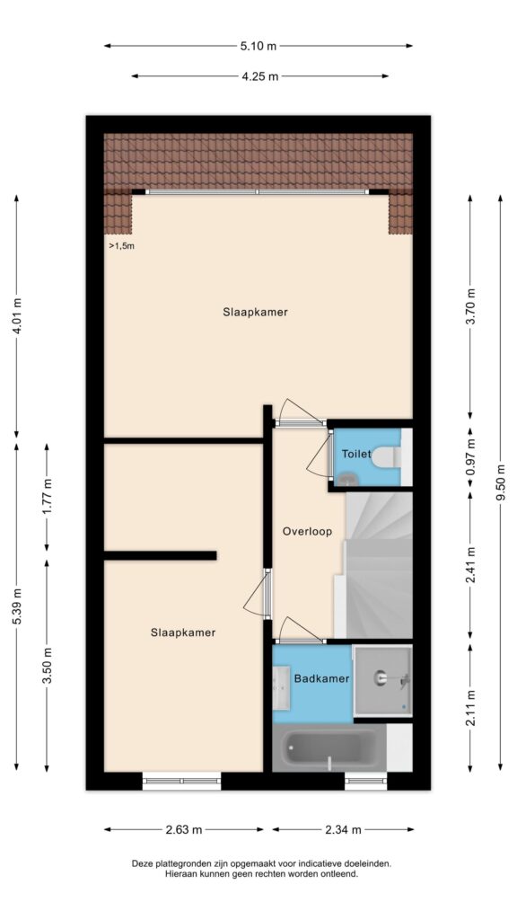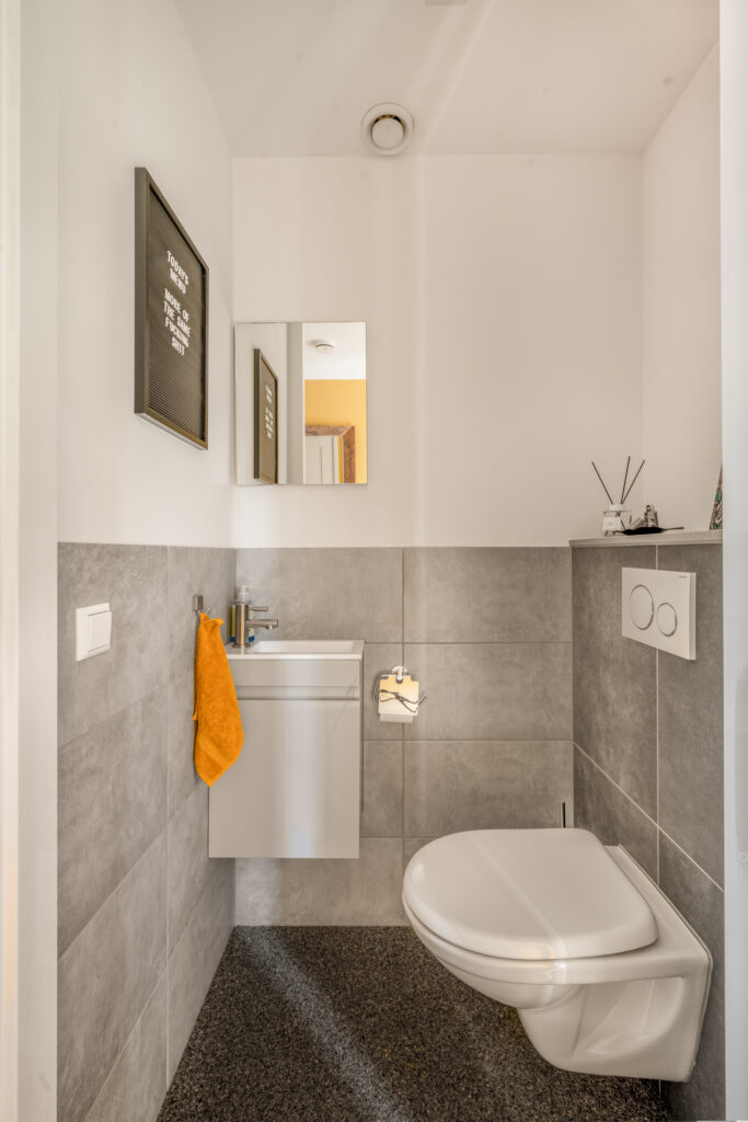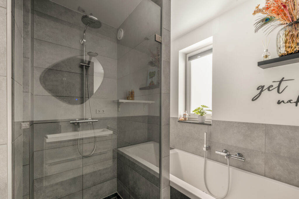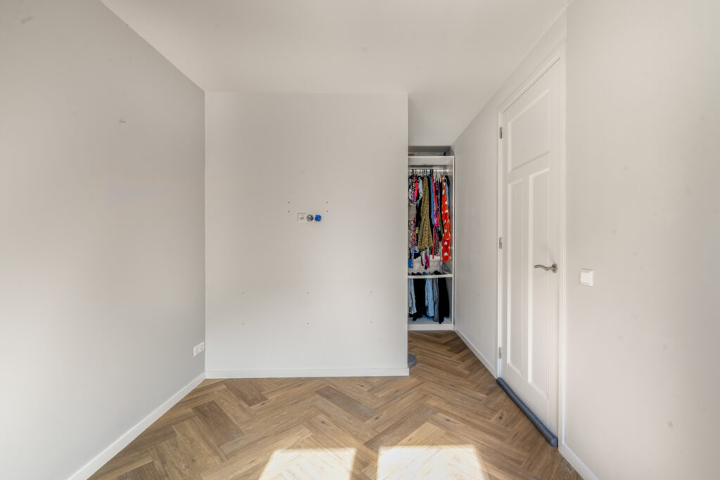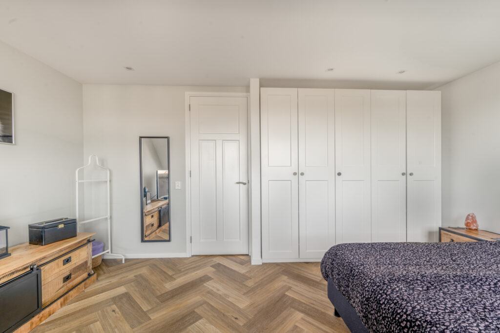 Op de eerste verdieping bevinden zich twee royale slaapkamers, beide strak afgewerkt met glad gestuukte wanden en plafonds en een prachtige pvc visgraatvloer. De slaapkamer aan de achterzijde is extra ruim dankzij een dakkapel over de volledige breedte. De moderne badkamer is compleet uitgerust met een ligbad, inloopdouche en een stijlvol wastafelmeubel. Het separate toilet met wandcloset bevindt zich eveneens op deze verdieping.