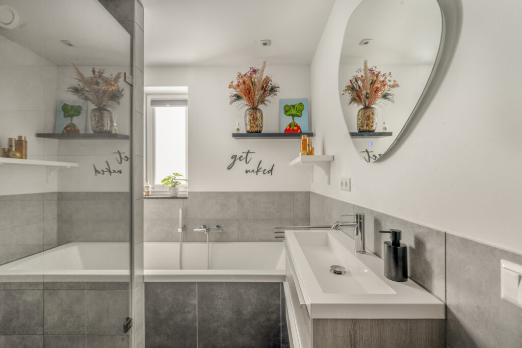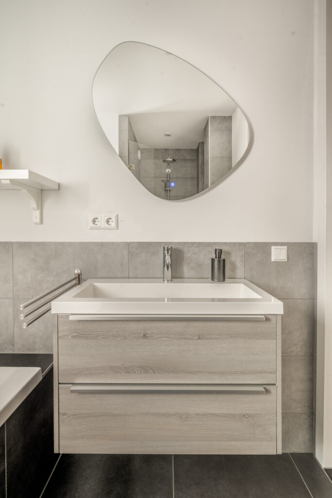 – verlaagd plafond in de woonkamer en badkamer met spotjes;