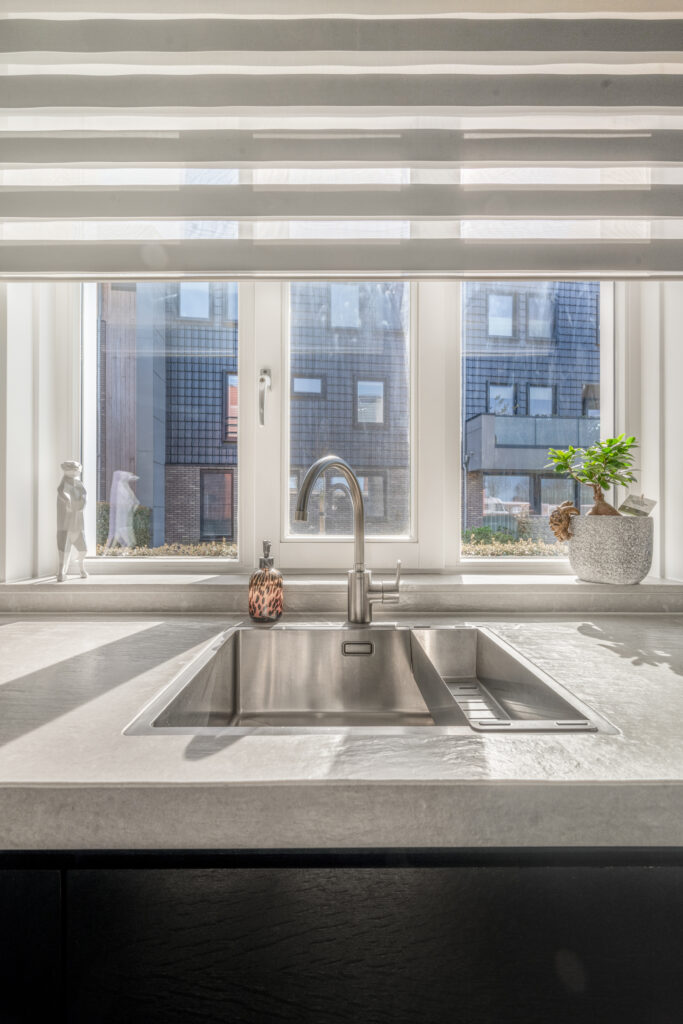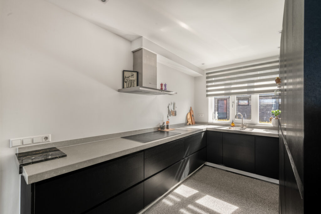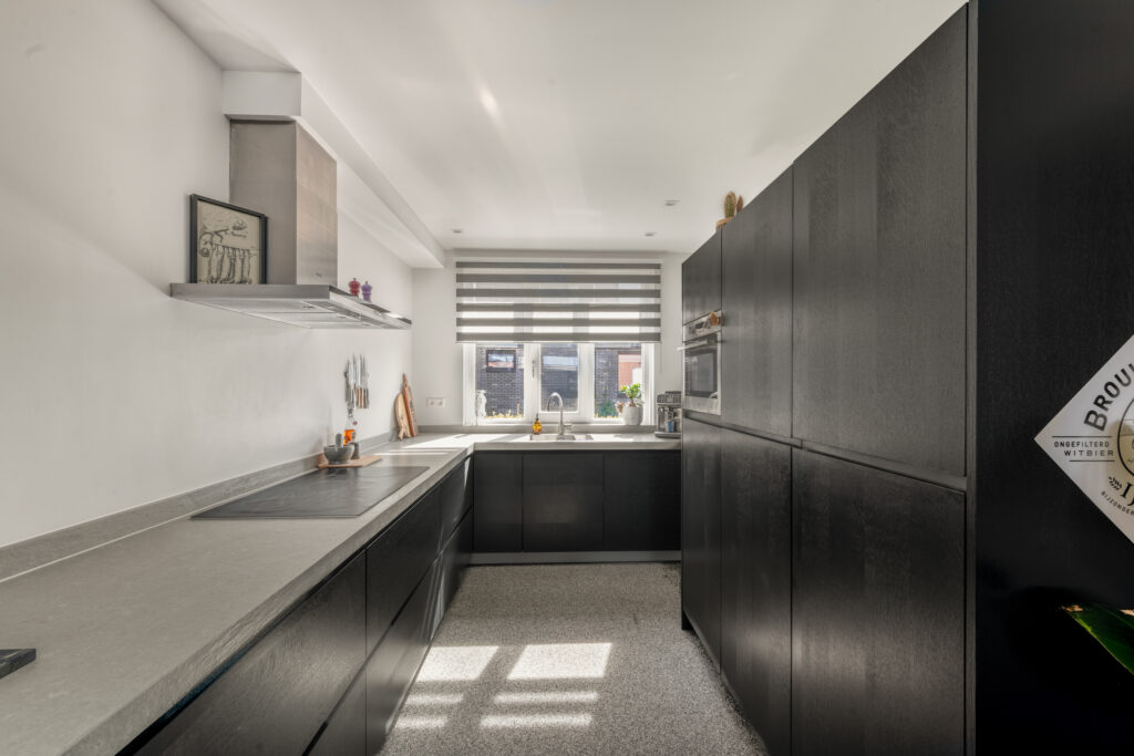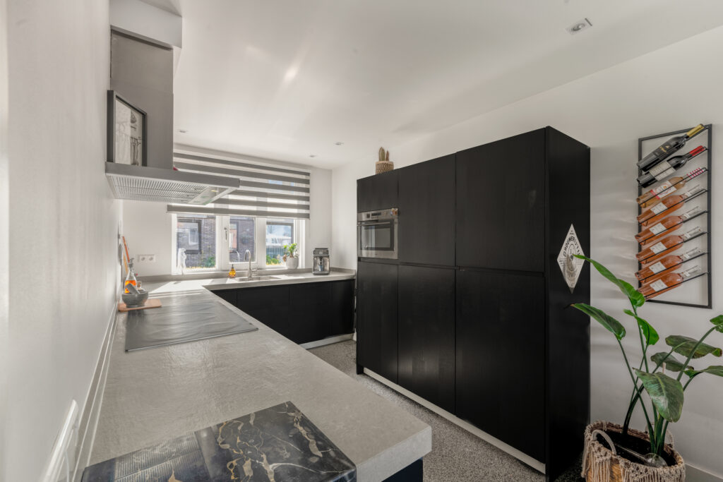 Bij binnenkomst word je direct verrast door de hoogwaardige afwerking. De strak gestuukte wanden, stijlvolle kleurstellingen en de fraaie grindvloer over de gehele begane grond zorgen voor een warme en moderne uitstraling. De vloerverwarming op de begane grond draagt bij aan extra comfort. Aan de voorzijde bevindt zich de op maat gemaakte open keuken in hoekopstelling met vaste kastenwand, voorzien van een luxe composiet werkblad en diverse inbouwapparatuur – een heerlijke plek voor kookliefhebbers.