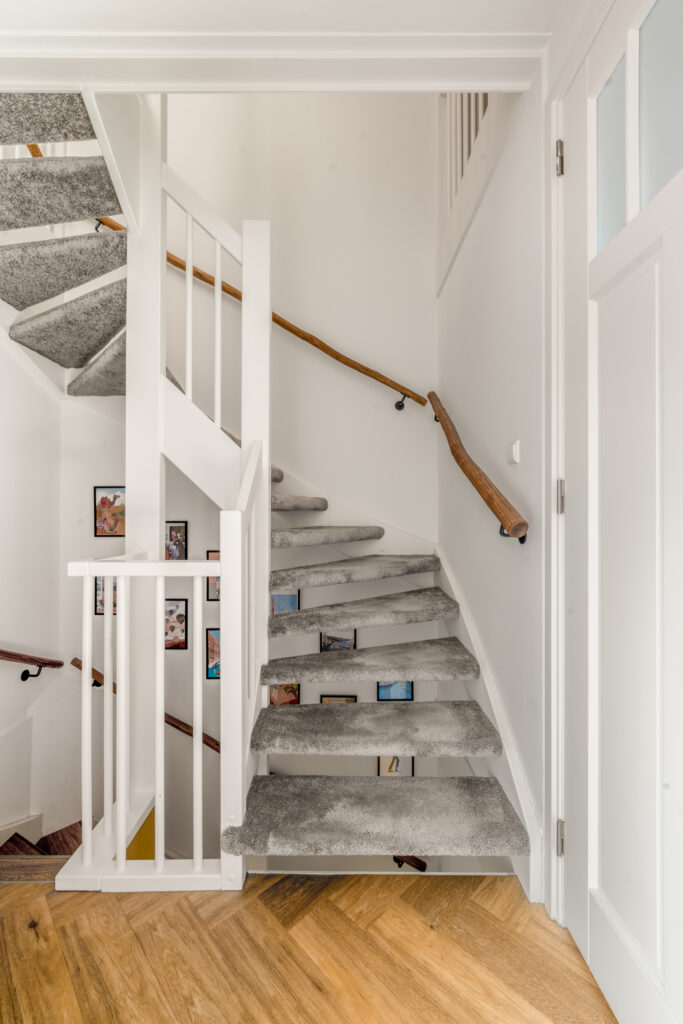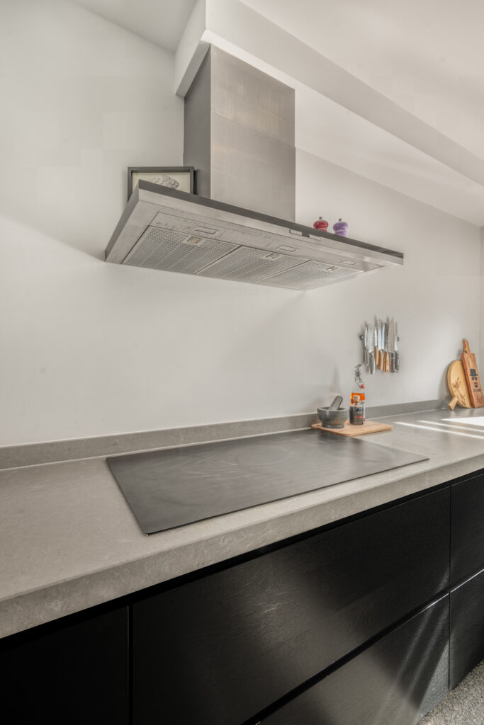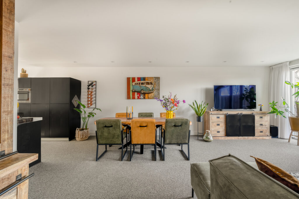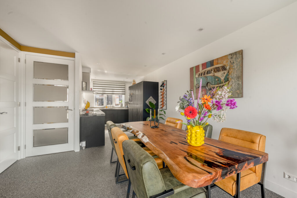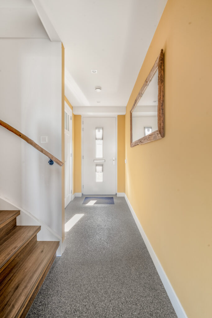 Bij binnenkomst word je direct verrast door de hoogwaardige afwerking. De strak gestuukte wanden, stijlvolle kleurstellingen en de fraaie grindvloer over de gehele begane grond zorgen voor een warme en moderne uitstraling. De vloerverwarming op de begane grond draagt bij aan extra comfort. Aan de voorzijde bevindt zich de op maat gemaakte open keuken in hoekopstelling met vaste kastenwand, voorzien van een luxe composiet werkblad en diverse inbouwapparatuur – een heerlijke plek voor kookliefhebbers.