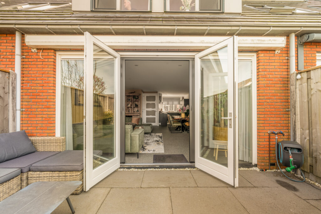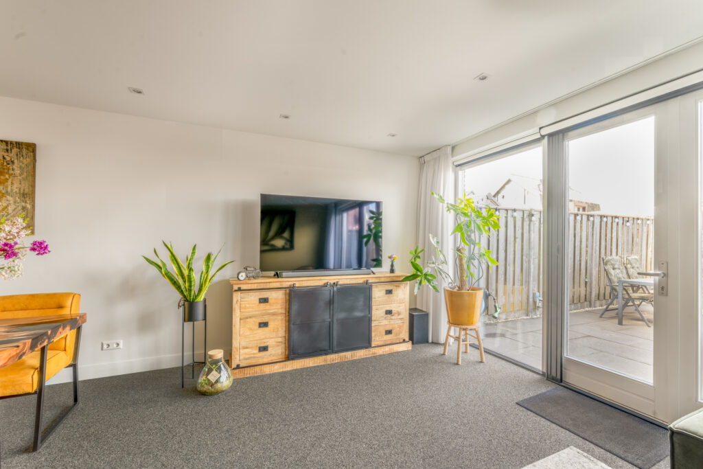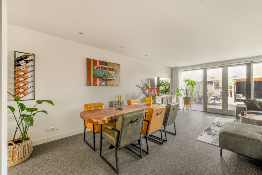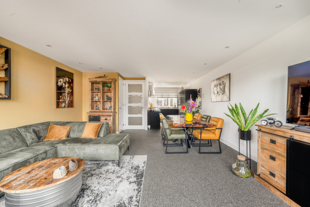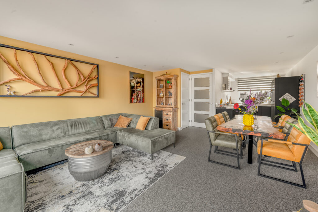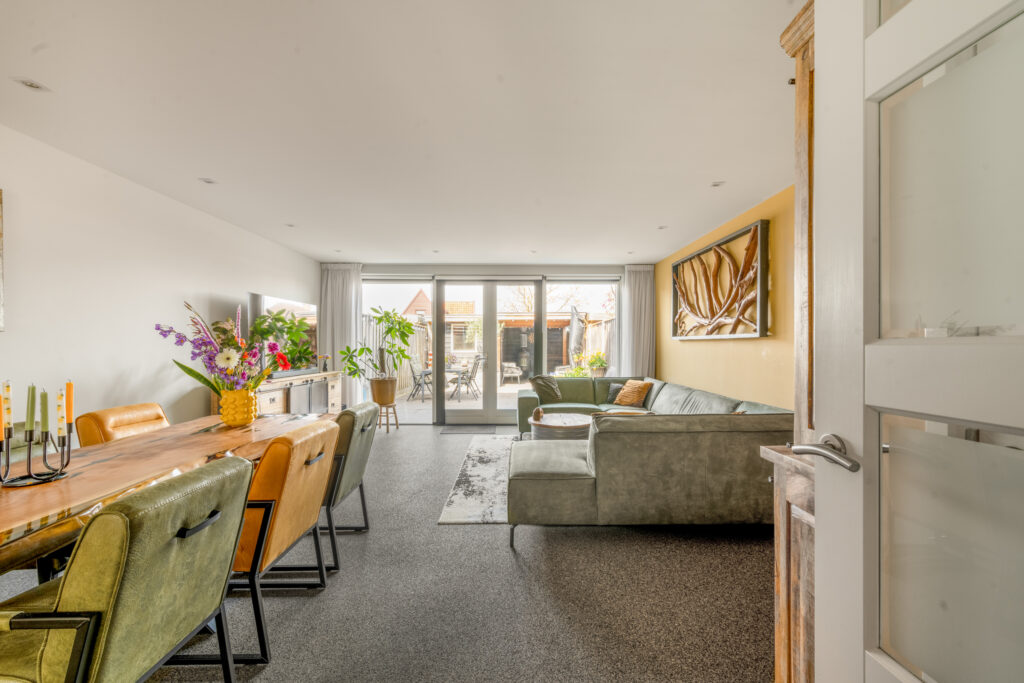 De tuingerichte woonkamer is een lichte en uitnodigende leefruimte dankzij de grote raampartij met openslaande deuren naar de tuin. Het verlaagde plafond met ingebouwde spots geeft het geheel een extra luxe uitstraling.