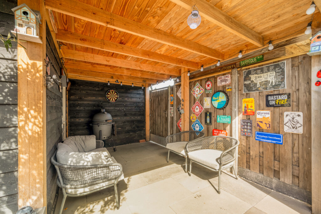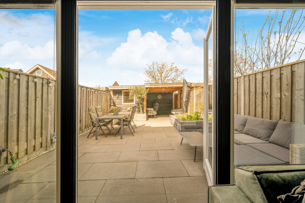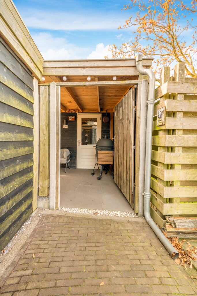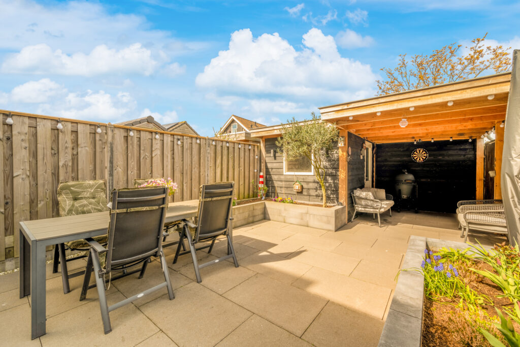 Ook buiten is het genieten: de onderhoudsvriendelijke achtertuin op het westen is modern aangelegd met strak straatwerk en stijlvolle plantenbakken. In 2020 is er een vrijstaande houten schuur met aangebouwde overkapping geplaatst, waar je tijdens zonnige dagen heerlijk beschut kunt ontspannen.