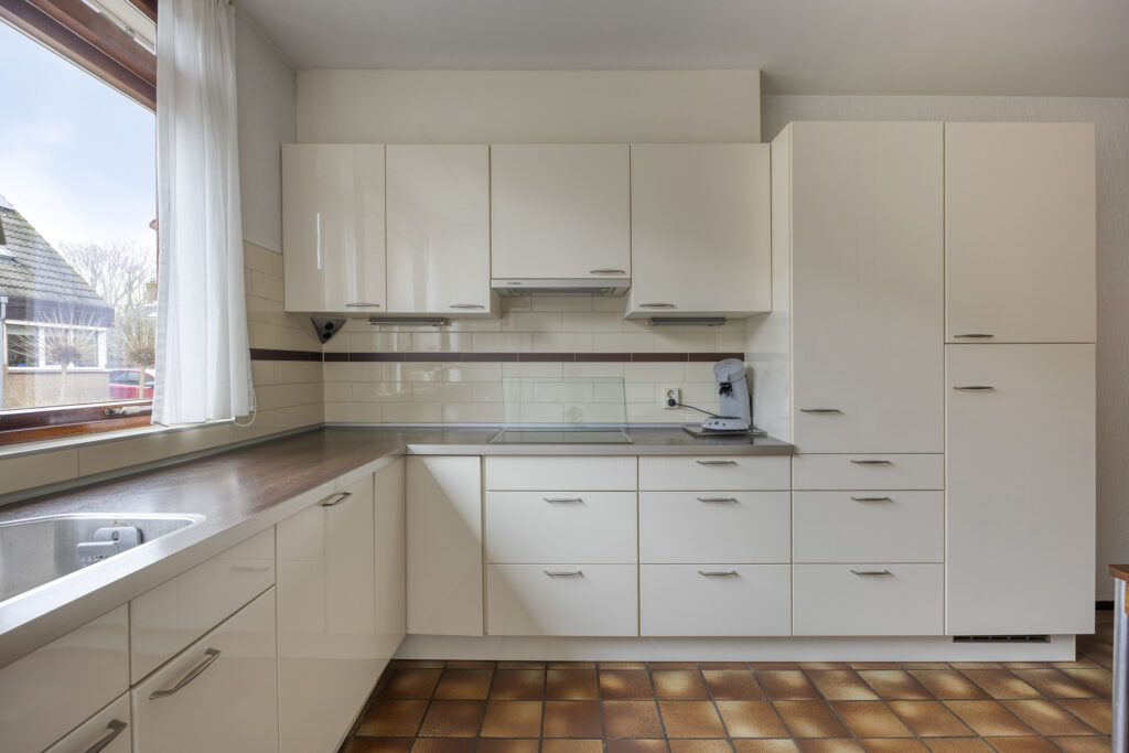 Aan de voorzijde ligt de halfopen keuken in hoekopstelling, uitgerust met diverse inbouwapparatuur waaronder een keramische kookplaat, afzuigkap, koelkast en een vaatwasser.