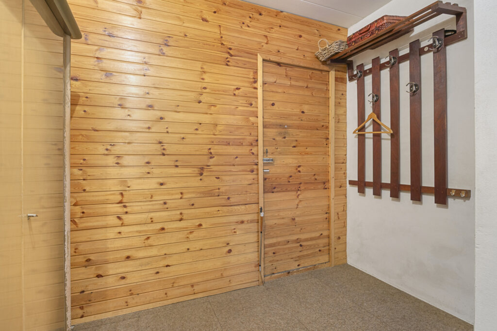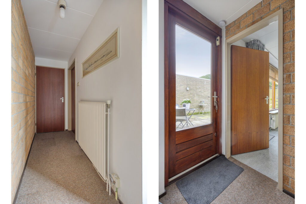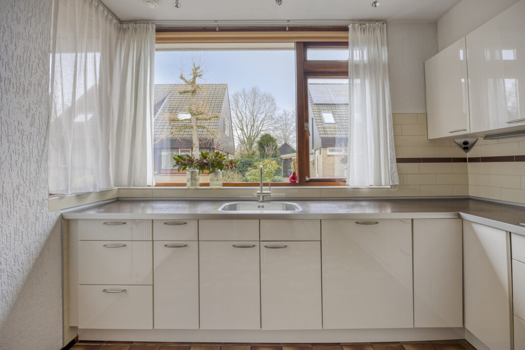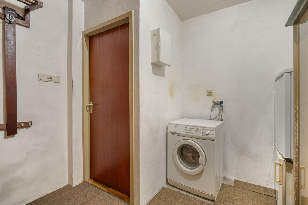 Via de gang is ook de bijkeuken, die plaats biedt aan o.a. de wasmachine, en de inpandige garage bereikbaar. De garage is uitgerust met een op afstand bedienbare garagedeur. Omdat de garage inpandig is is deze gemakkelijk te veranderen in een kantoor- of praktijkruimte met eigen toegangsdeur en pantry met toiletruimte in de huidige bijkeuken.