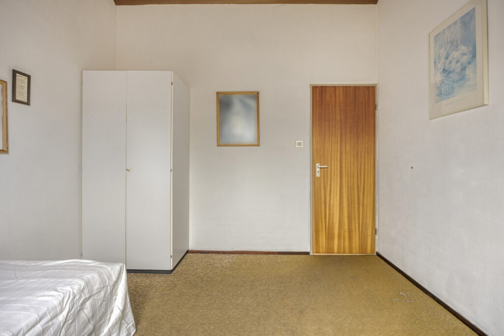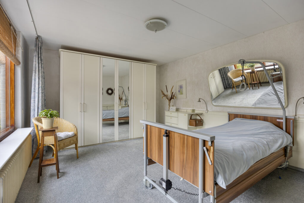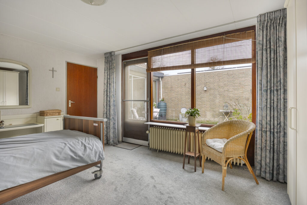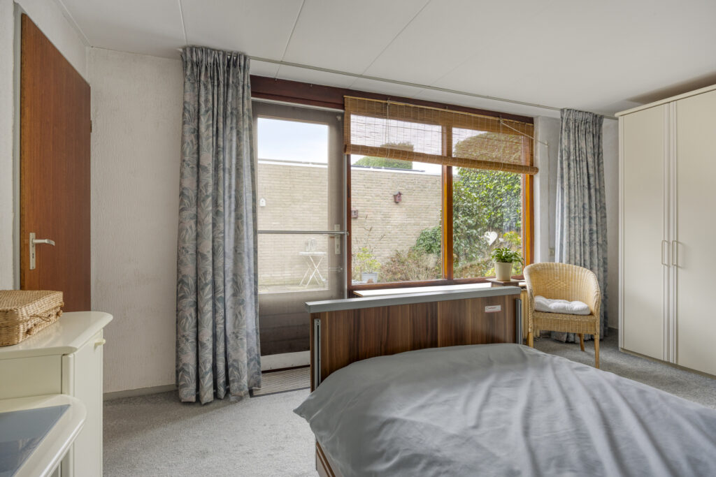 Via de woonkamer bereikt u de gang aan de achterzijde met toegang tot de slaapkamer en de badkamer op de begane grond. De badkamer is voorzien van een ruime inloopdouche, wastafel en tweede toilet. De slaapkamer heeft directe toegang tot de zonnige tuin.