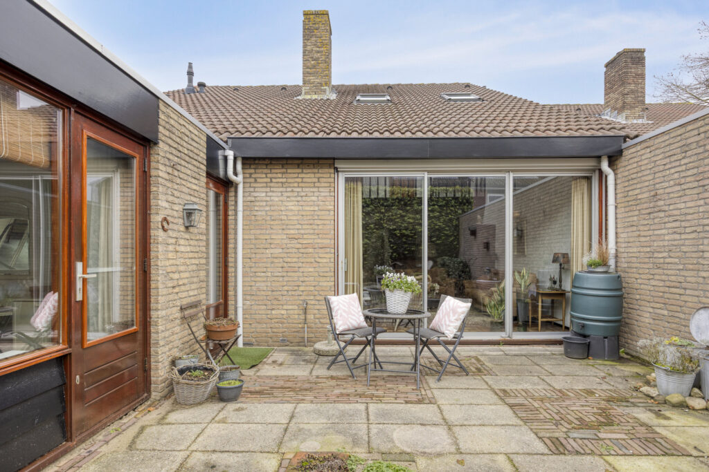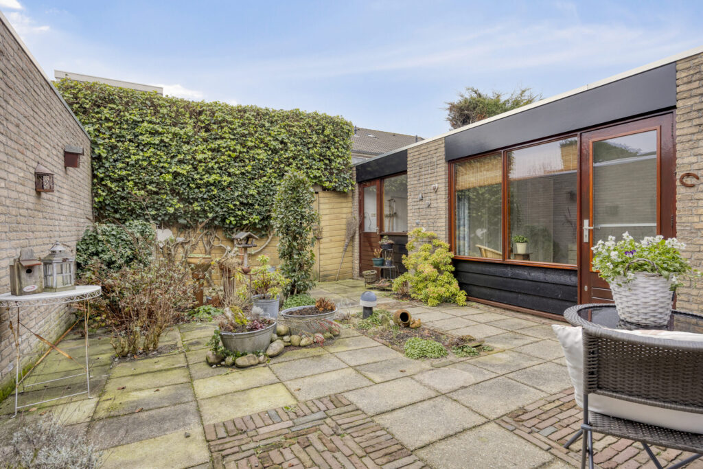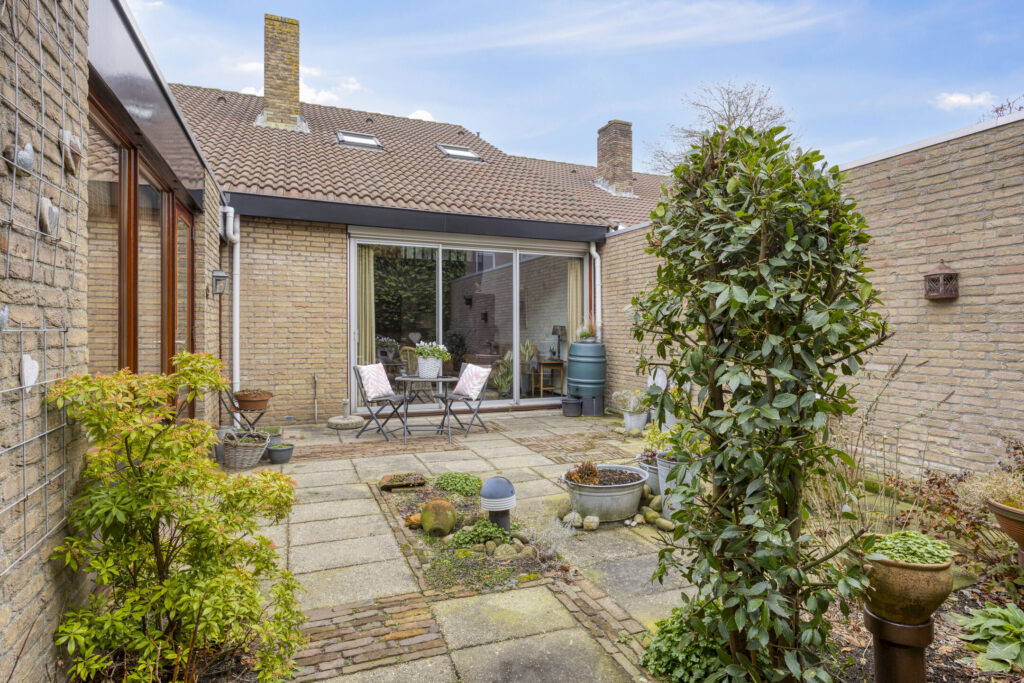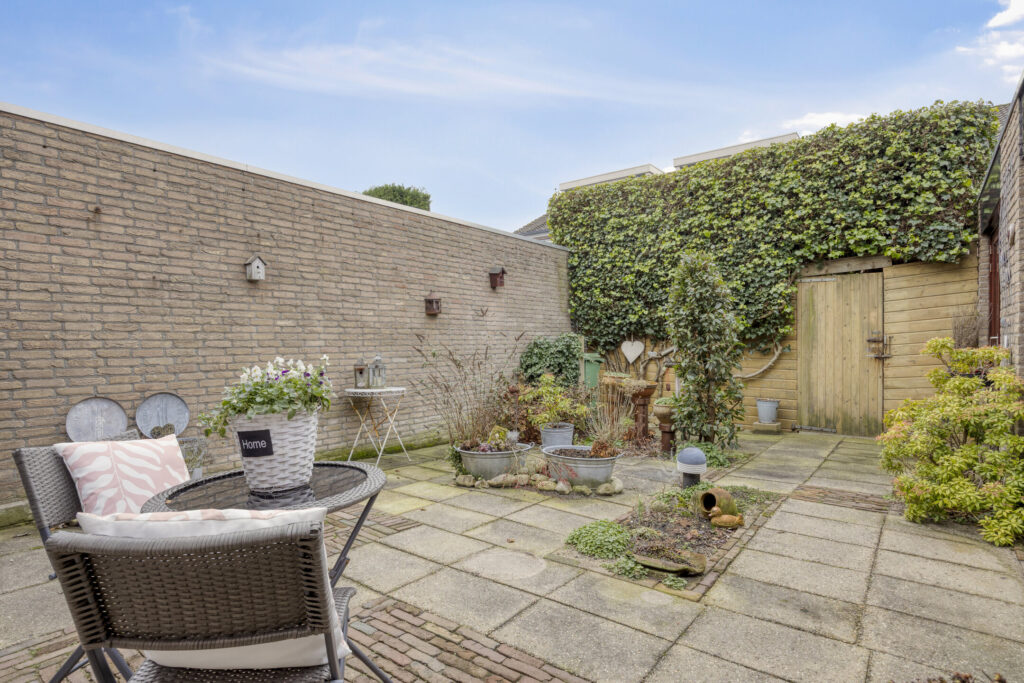 De achtertuin is stijlvol aangelegd en biedt een oase van rust en privacy. Met zijn zuidwestelijke ligging is het hier heerlijk vertoeven in de zon. Daarnaast is er een separate berging aanwezig en een achterom voor extra gemak.