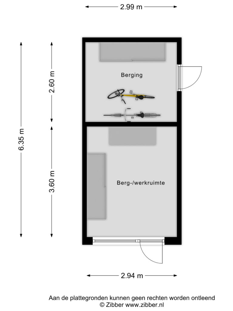 De garage/berging is momenteel verdeeld in twee ruimtes: een nette werk/hobbyruimte (van ca. 11 m²) met een hardhouten pui met een raam en loopdeur met dubbel glas aan de voorzijde en een berging (van ca. 8 m²) aan de achterzijde, welke vanuit de achtertuin toegankelijk is. E.e.a. kan desgewenst weer vrij eenvoudig terug gebracht worden naar een volledige garage.