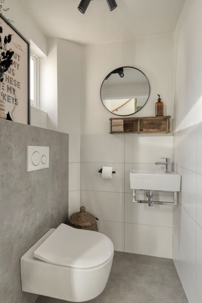 De fraai gerenoveerde toiletruimte, met een verlaagd plafond en een raampje in de zijgevel, is volledig betegeld en voorzien van een ‘Villery & Boch’ wandcloset en een fonteintje.