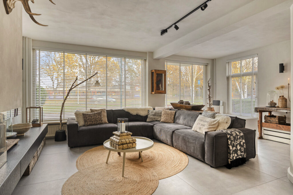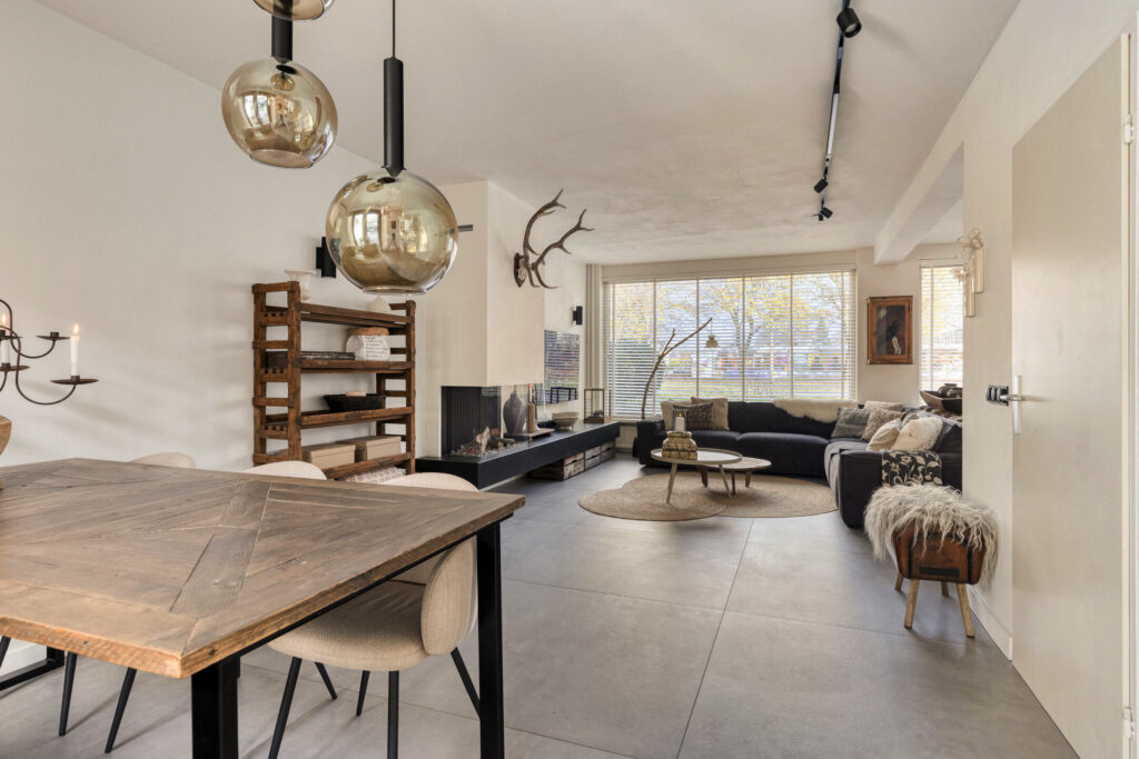 De royale en sfeervolle, L-vormige woonkamer (ca. 39 m²) heeft veel daglichttoetreding en uitzicht vanwege de grote raampartijen met brede vensterbanken in de voor- en zijgevel en is licht en modern afgewerkt. De eyecatcher in deze woonkamer is de prachtige ‘Kalfire’ design-gashaard met ‘natural spark generator’, die de winteravonden verandert in knusse momenten. Daarnaast bevinden zich hier de pomp/verdeler t.b.v. de vloerverwarming en de glasvezelaansluiting, alsmede een airco-unit t.b.v. koelen en verwarmen, welk zorgt voor een optimaal comfort gedurende alle jaargetijden. De dubbele tuindeuren aan de achterzijde geven vervolgens toegang tot de terrasoverkapping.