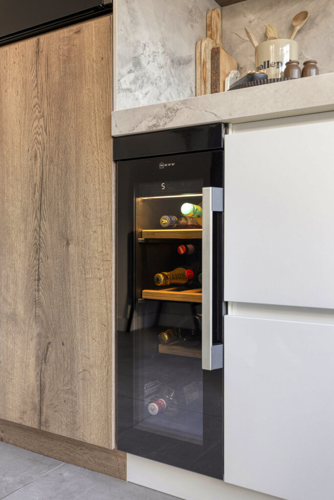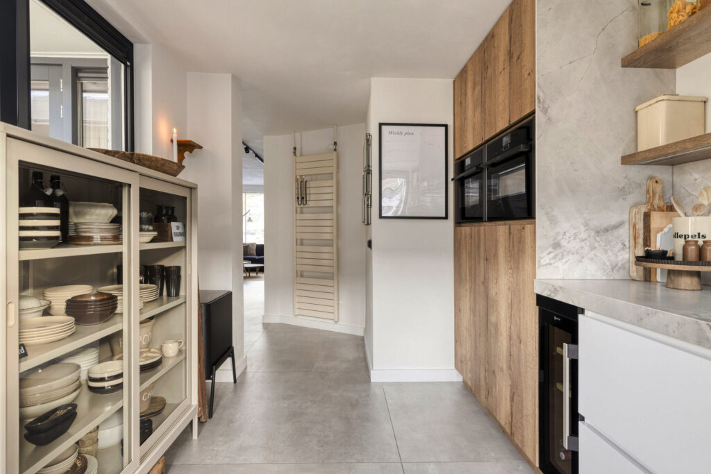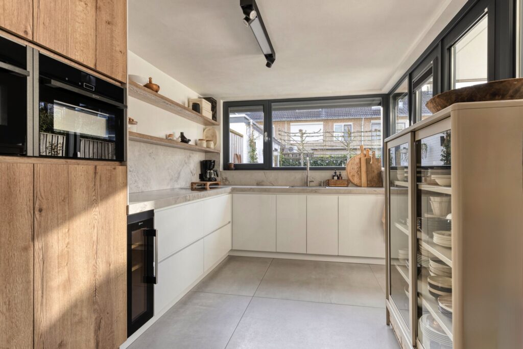 De uitgebouwde en lichte, semi-open keuken aan de achterzijde van de woning nodigt uit tot heerlijk koken. Deze keuken is ingericht met een luxe, hoekopgestelde installatie met diverse kasten en laden, een wandplank met op afstand bedienbare LED-verlichting, een stenen aanrechtblad en achterwand met diverse stopcontacten, een RVS spoelbak met een éénhendelmengkraan met een ‘Quooker’ en zeepdispenser, een ‘Novy’ inductiekookplaat met geïntegreerde afzuiging en een vaatwasser, combi-stoom-/heteluchtoven, combi-magnetron/oven, koelkast, vriezer en wijnklimaatkast (allen van ‘Neff’).