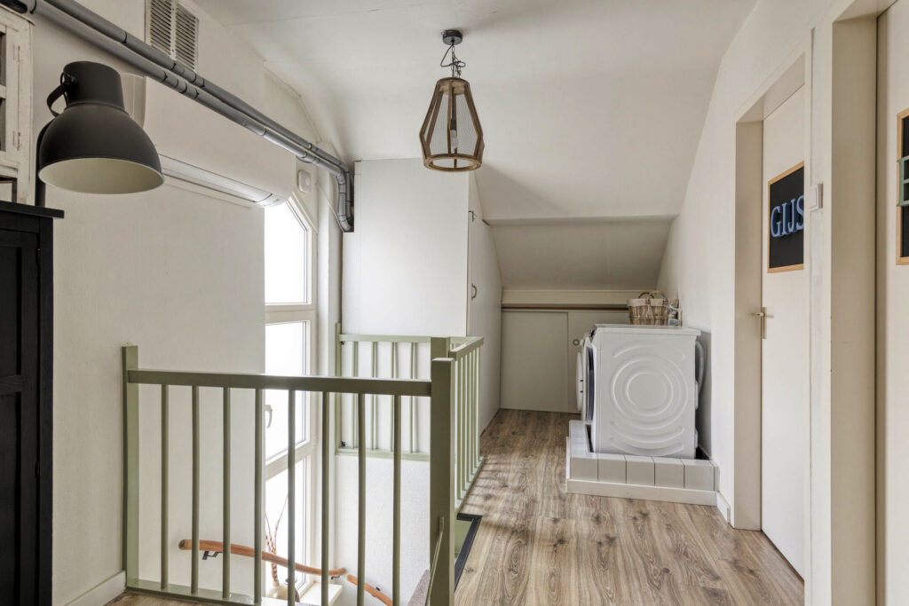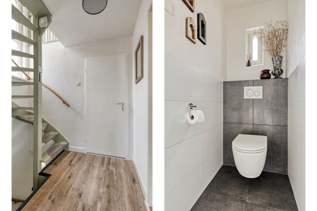 Hier bevinden zich het vernieuwde toilet, de trapopgang naar de verdieping en een praktische, verdiepte kelderkast met legplanken en de vernieuwde, uitgebreide meterkast.