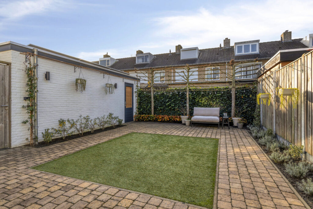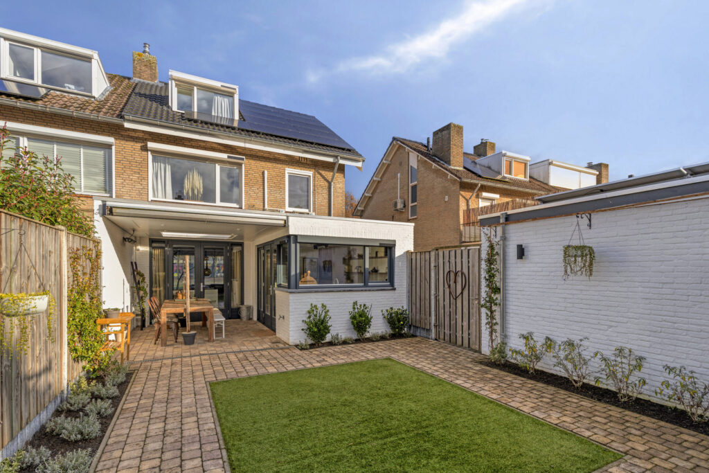 De achtertuin is geheel omsloten middels houten schuttingen en keurig aangelegd met sierbestrating en kunstgras, plantenborders en een leilinde aan de achterzijde t.b.v. de privacy.