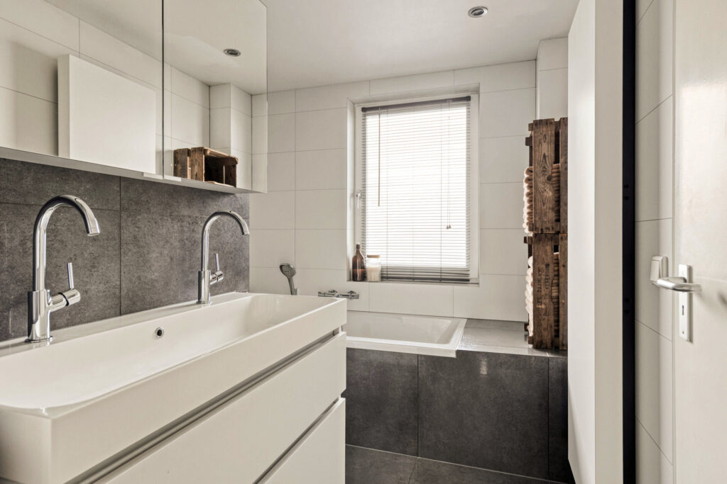 De eveneens gerenoveerde, luxe afgewerkte en functioneel ingedeelde badkamer, met een verlaagd plafond met LED-inbouwspots, is voorzien van een ligbad, een ruime inloopdouche met een regen- en handdouche, een breed wastafelmeubel met 2 kranen en een dubbel bovenkastje, indirecte vloerverwarming, een designradiator en mechanische ventilatie. Het hardhouten draai-/kiepraam in de achtergevel zorgt hier tevens voor de directe daglichttoetreding en extra ventilatiemogelijkheid.