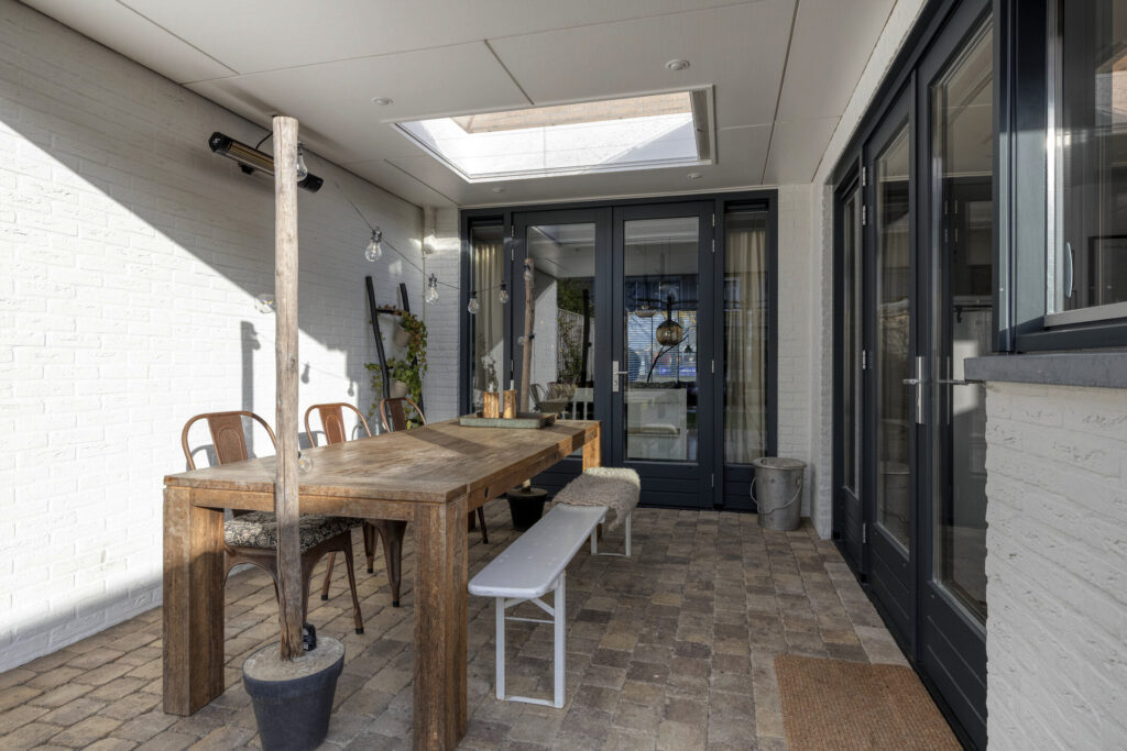 Deze gezellige terrasoverkapping (van ± 13 m²) is voorzien van een kunststof lichtkoepel met zonwering en een plafond met inbouwspots, elektra en stopcontacten, een buitenkraantje met putje tegen de zijgevel van de keuken en een afvoergootje en zonneluifel aan de tuinzijde. Hier kun je ‘s morgens je eerste kopje koffie drinken en heerlijk vertoeven met familie en vrienden tijdens de lange zomeravonden.