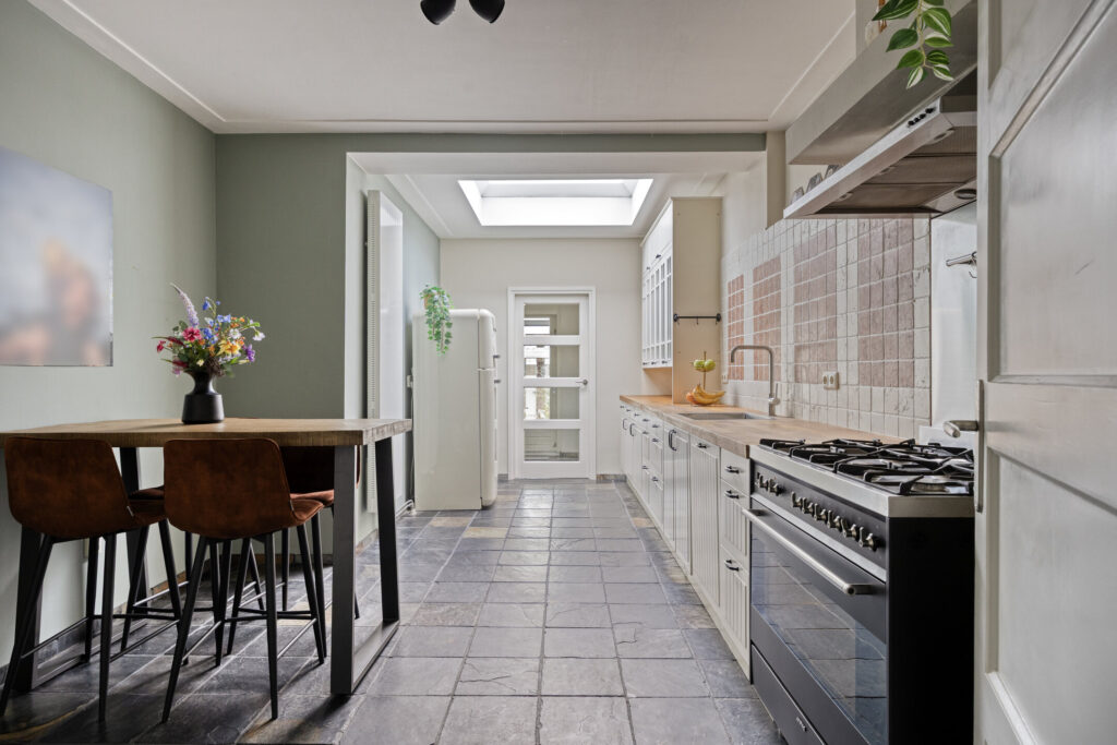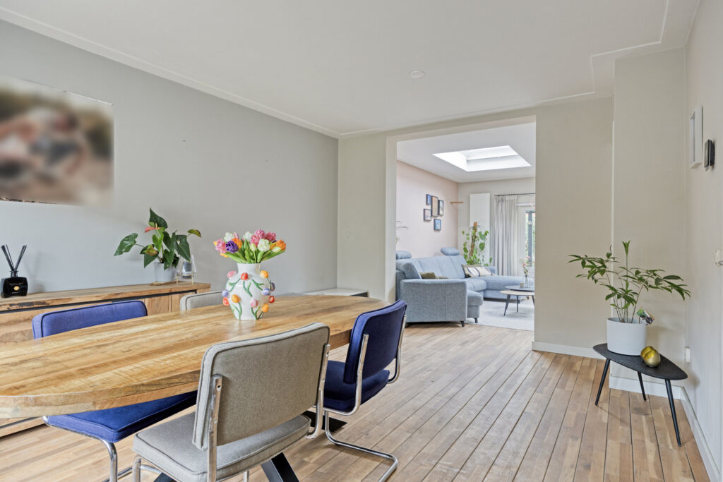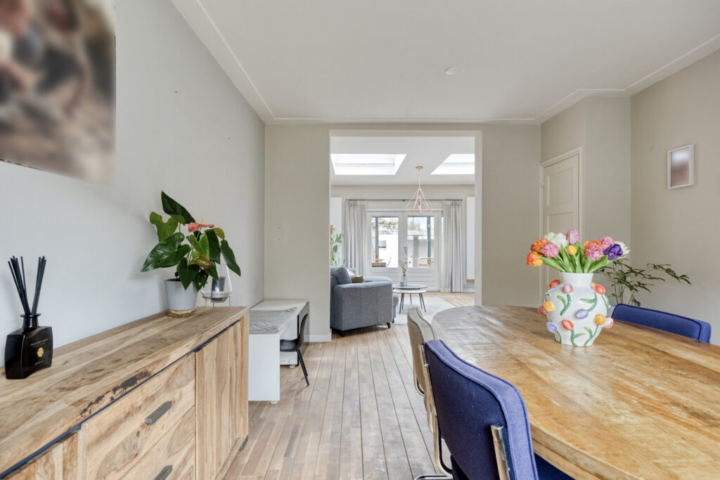 Zodra je binnenstapt, voel je het direct: dit is een woning met karakter. Authentieke details zoals paneeldeuren en stijlvolle afwerkingen worden gecombineerd met modern wooncomfort. Dankzij de royale uitbouw is de begane grond uitzonderlijk ruim en licht, met een fijne leefkeuken en een sfeervolle woonkamer met lichtkoepels en openslaande tuindeuren.