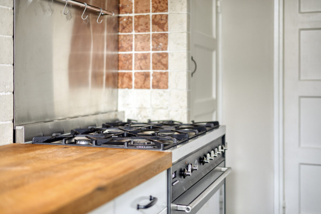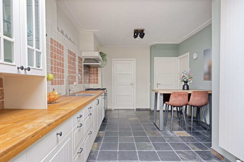 Aansluitend aan de keuken bevindt zich een praktische bijkeuken met aansluitingen voor wasapparatuur en opstelling van de cv-ketel (Nefit HR 2015). Vanuit hier is eveneens de tuin bereikbaar. De woonkeuken is voorzien van een ruime lengte opstelling met boven- en onderkasten, een eikenhouten werkblad, Smeg 5-pitsgasfornuis met oven, afzuigkap en vaatwasser. De keukenvloer is voorzien van leisteen tegels.